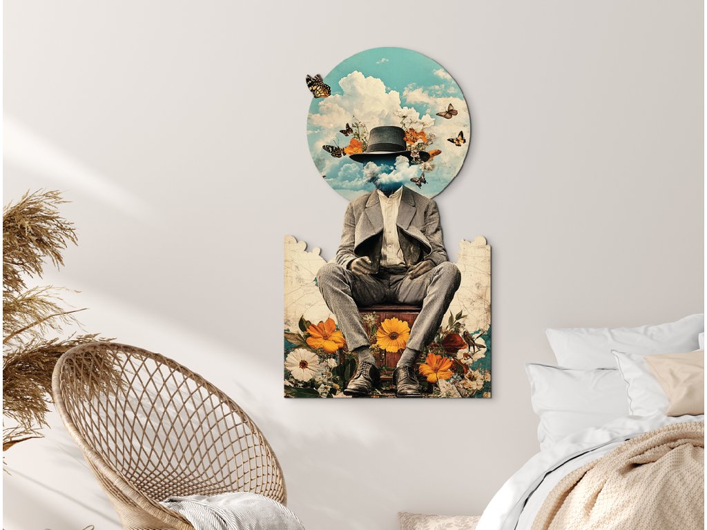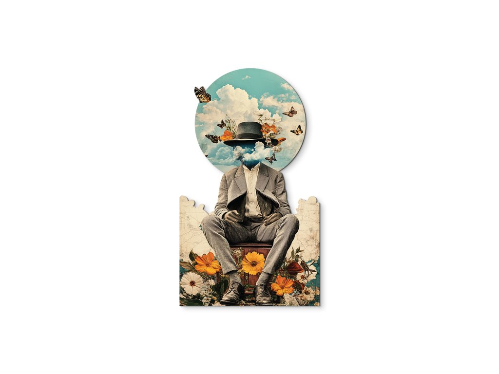 Toto snové dílo zobrazuje postavu v elegantním obleku a klobouku, jejíž hlava se rozplývá v oblacích – jako metafora zamyšlení, volnosti a touhy po úniku. Na pozadí modré oblohy poletují motýli, které spolu s květinovým podstavcem v teplých tónech oranžové a bílé symbolizují jaro, obnovu a klidné spojení člověka s přírodou.