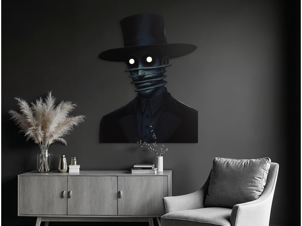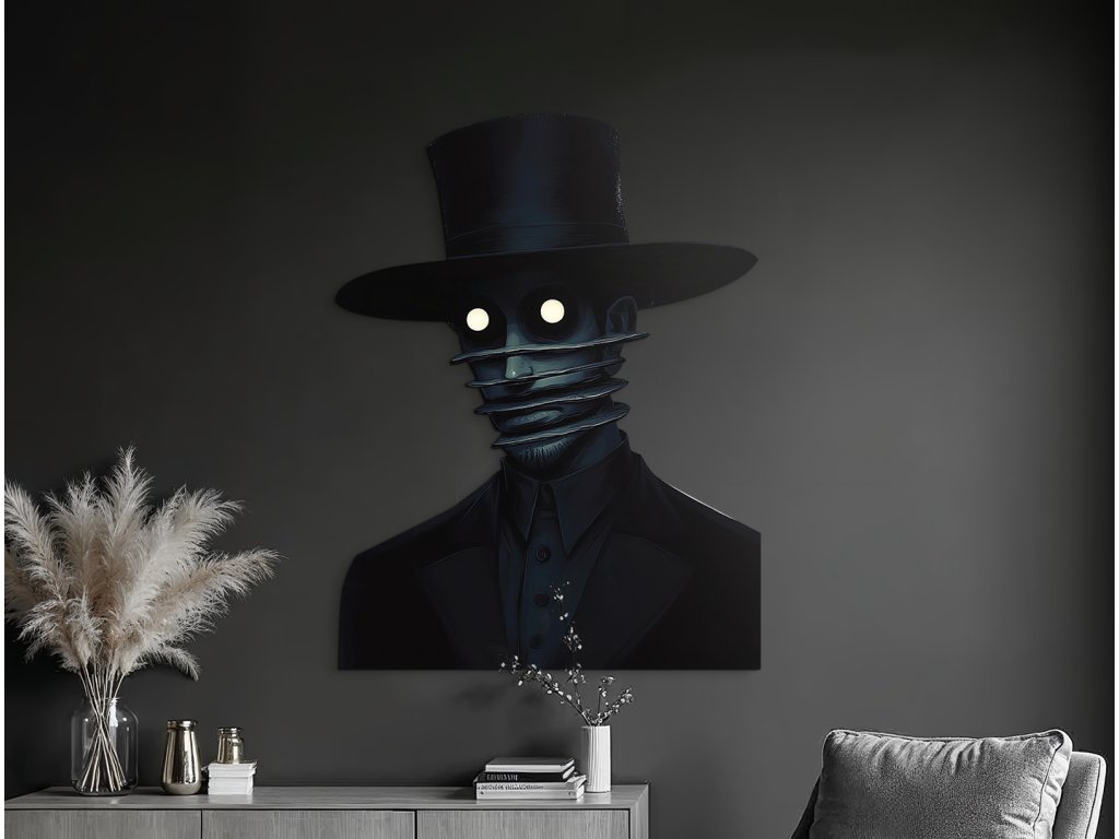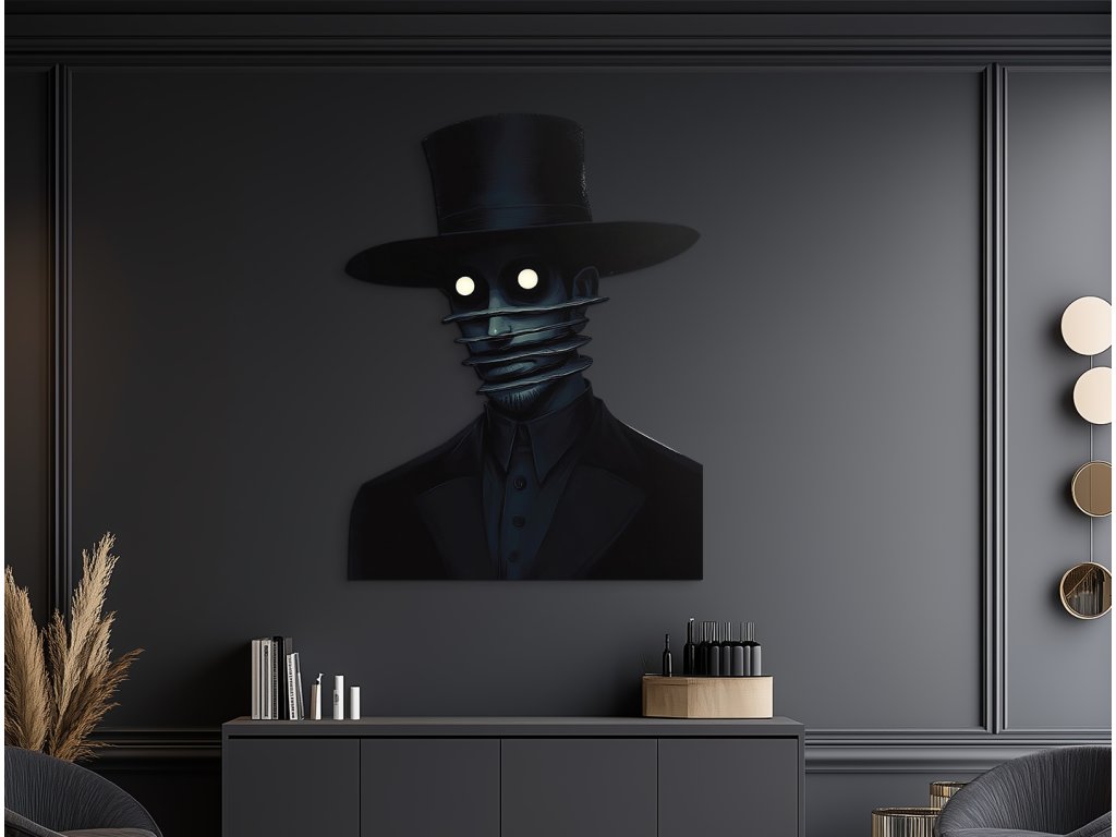 Znepokojující a zároveň fascinující postava v černém cylindru zaujme na první pohled. Její segmentovaný krk jako pružina a zářivé oči v tmavém stínu obličeje vytvářejí zvláštní atmosféru tajemství a napětí. Dílo balancuje na hraně surrealismu a gotické fantazie, vyvolávaje otázky, které zůstávají nezodpovězeny.