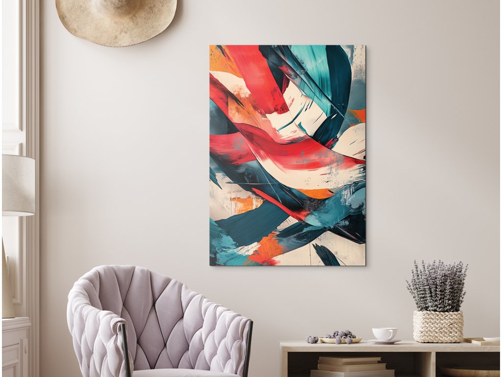 Abstraktní malba plná energie a života využívá odvážné tahy štětcem a kontrastní barvy – červenou, tyrkysovou, oranžovou a bílou. Kompozice působí spontánně a expresivně, čímž vyvolává pocit pohybu a emoce v divákovi.