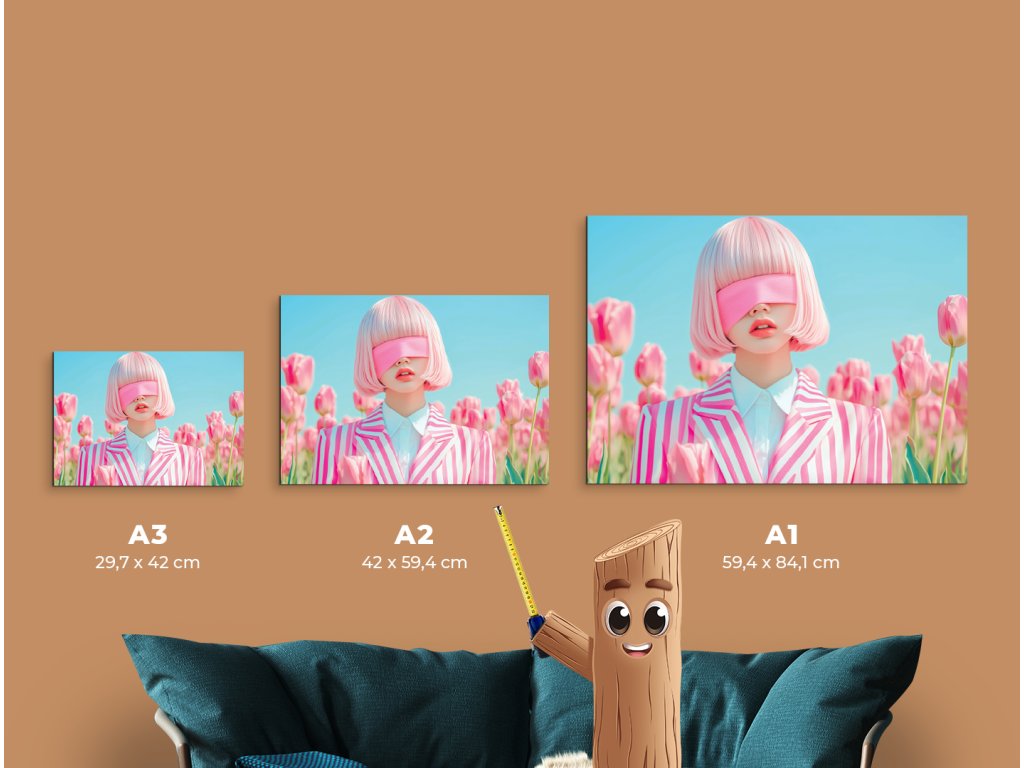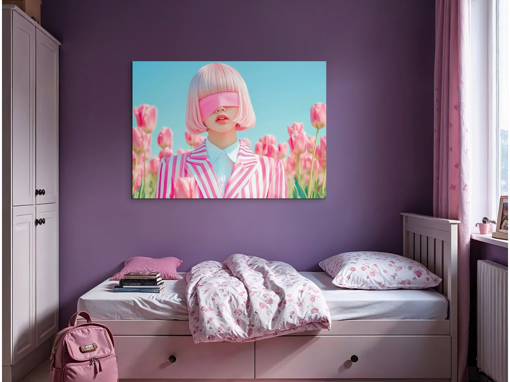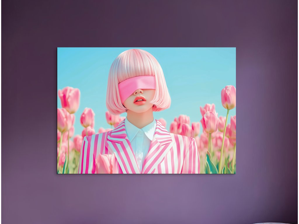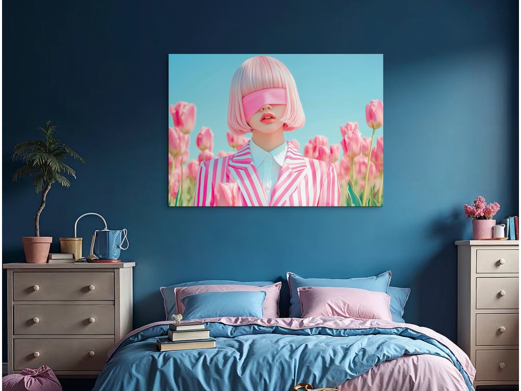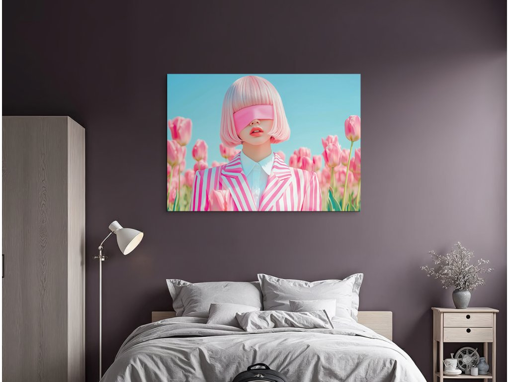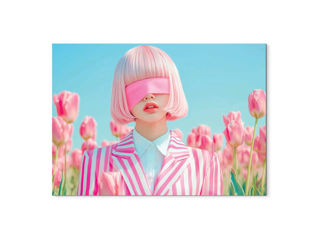 Obraz zobrazuje výrazně stylizovanou postavu s krátkými růžovými vlasy a růžovou páskou přes oči, která stojí v rozkvetlém poli růžových tulipánů. Postava je oblečená v růžovo-bílém pruhovaném saku a bílém. Jasná modrá obloha v pozadí kontrastuje s růžovými tóny, čímž vytváří surrealistickou a vizuálně poutavou kompozici.