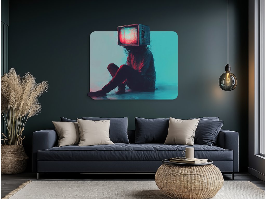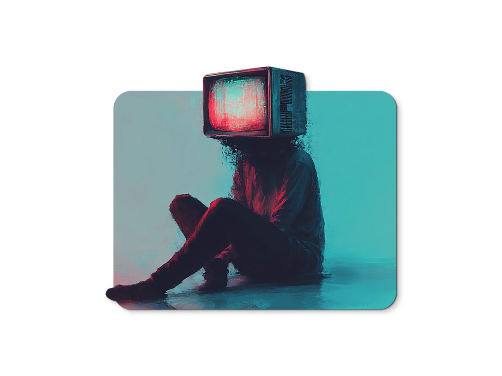 Obrázek zobrazuje postavu sedící na zemi s retro televizorem namísto hlavy. Scéna je osvětlena kontrastním modro-červeným světlem, což podtrhuje pocit odcizení, mediálního přetížení nebo izolace v digitálním světě.