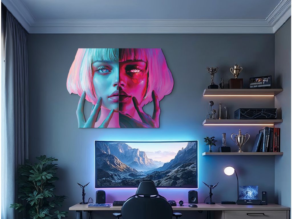Tento fantasy obraz zobrazuje ženský obličej rozdělený na dvě poloviny, z nichž každá nese odlišnou barevnost, náladu a osvětlení. Jedna strana září teplými tóny světla, zatímco druhá se noří do temnějších, chladnějších odstínů, čímž vzniká kontrast mezi světlem a stínem, vědomím a podvědomím, klidem a neklidem. Kompozice vyvolává dojem vnitřního zápasu, rovnováhy nebo transformace.