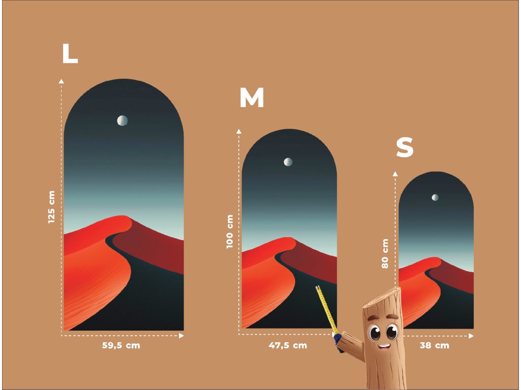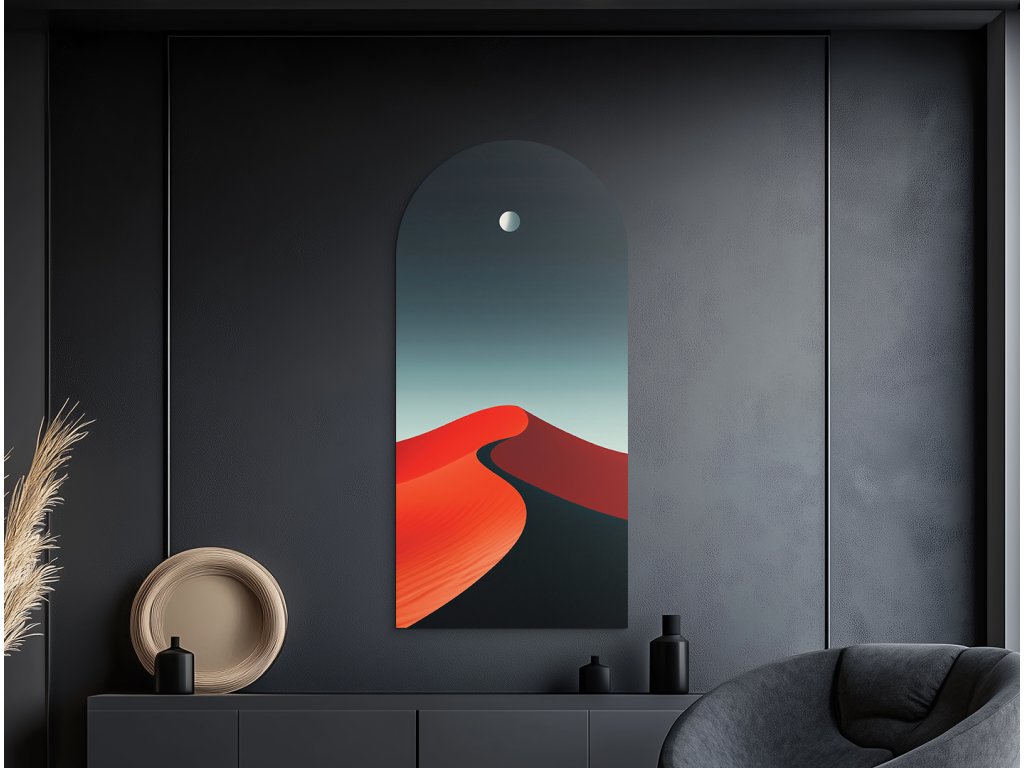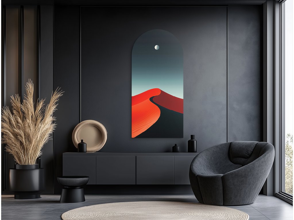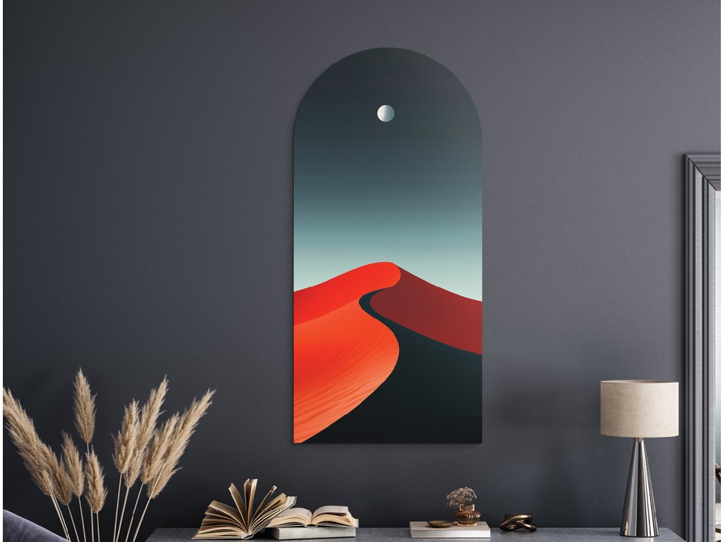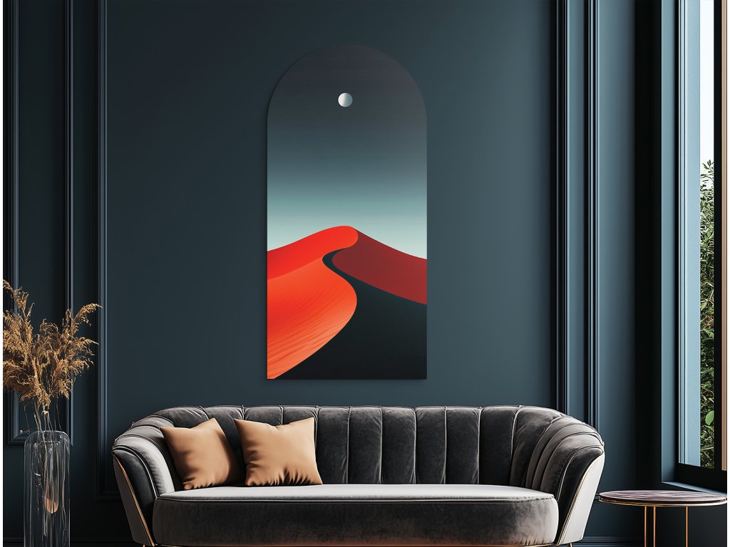Obraz zachycuje dramatickou scenérii s výraznou červenou pískovou dunou, která vystupuje z tmavého, téměř hrozivého pozadí. Nad ní se vznáší bílý kruhový útvar evokující měsíc, čímž celá kompozice působí tajemně a snově.