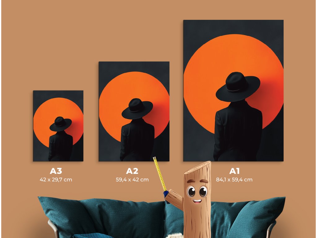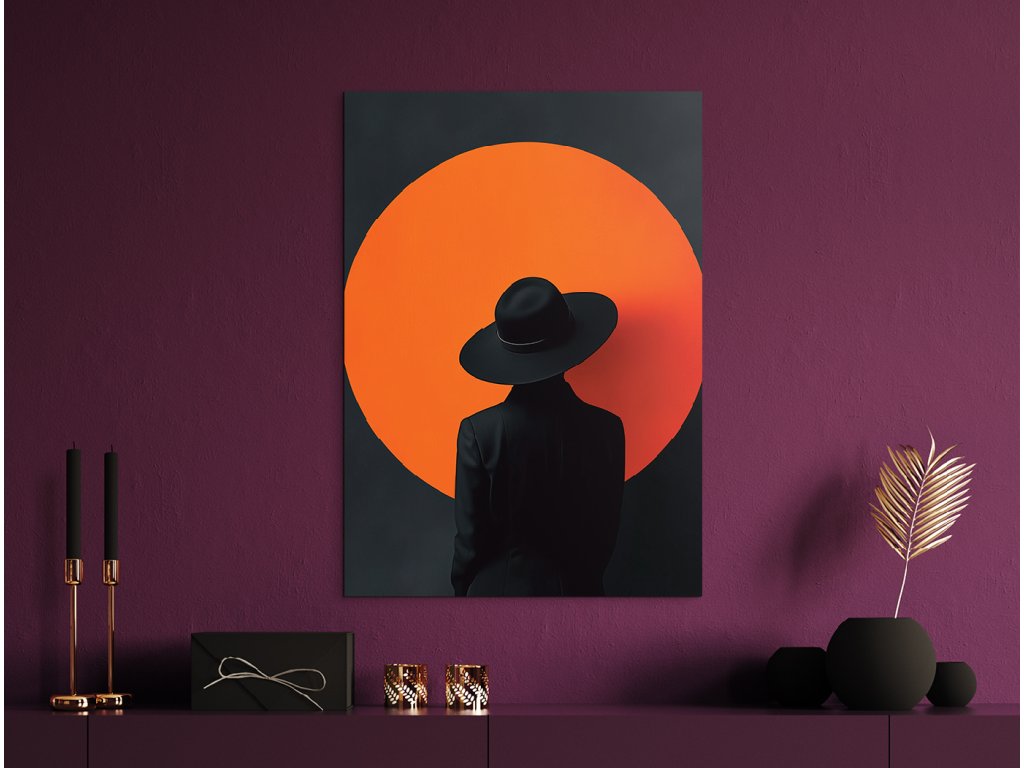 Minimalistický obraz zobrazuje siluetu ženy s kloboukem, umístěnou před výrazným oranžovým kruhem, který evokuje slunce nebo měsíc. Obraz využívá jednoduché linie, tlumené barvy a kontrast mezi figurou a pozadím, čímž vytváří elegantní a nadčasovou kompozici.