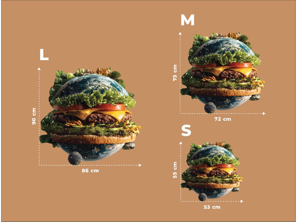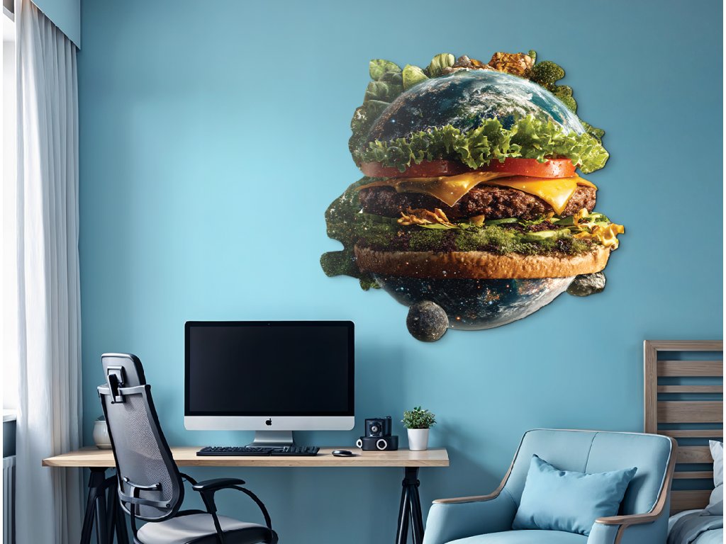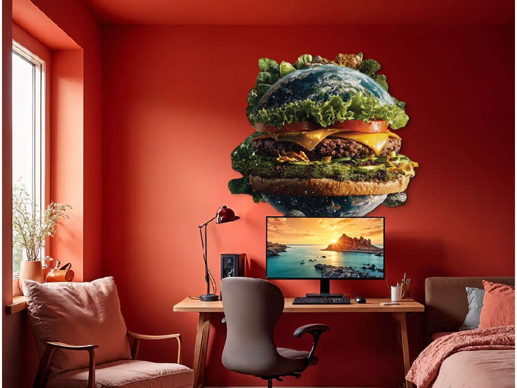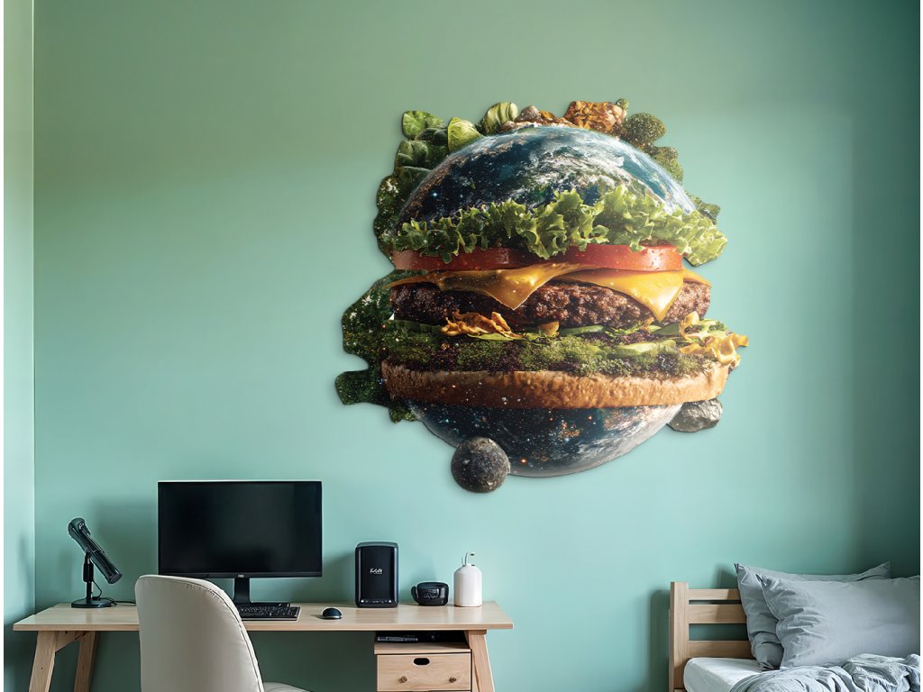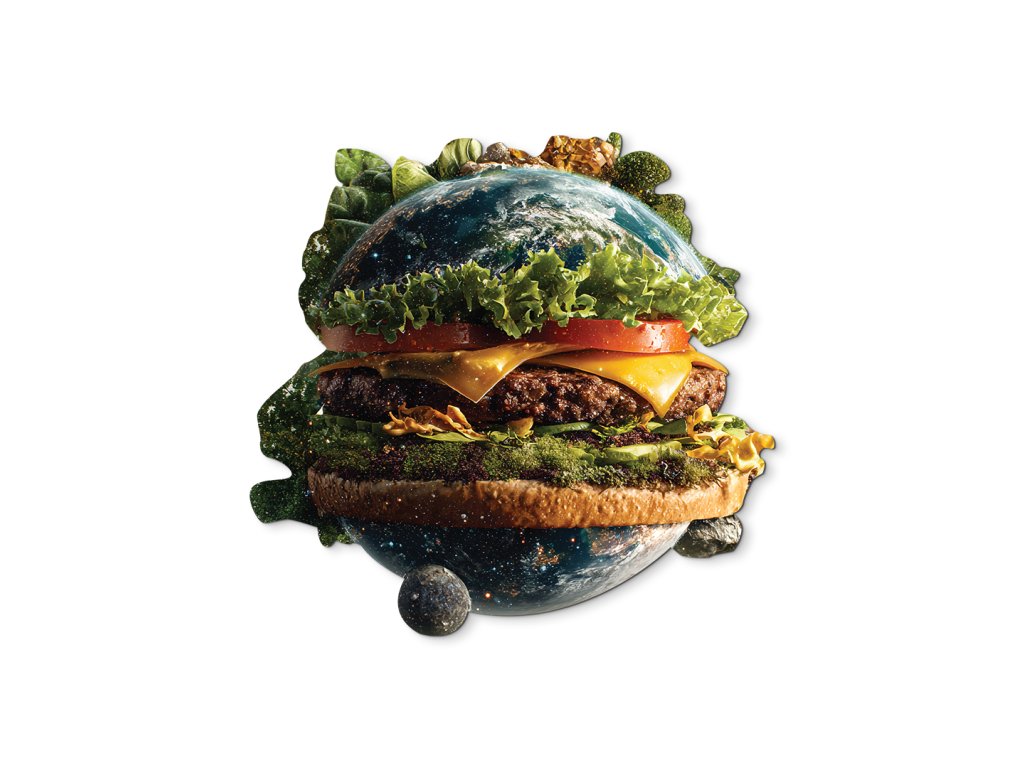 Obrázek zobrazuje planetuZemě ztvárněnou jako hamburger, přičemž kontinenty tvoří "housku" a mezi nimi se nachází zelenina a další ingredience. Jedná se o silnou vizuální metaforu, která upozorňuje na propojení mezi globálním stravováním, udržitelností a ekologickým dopadem potravinové výroby.
