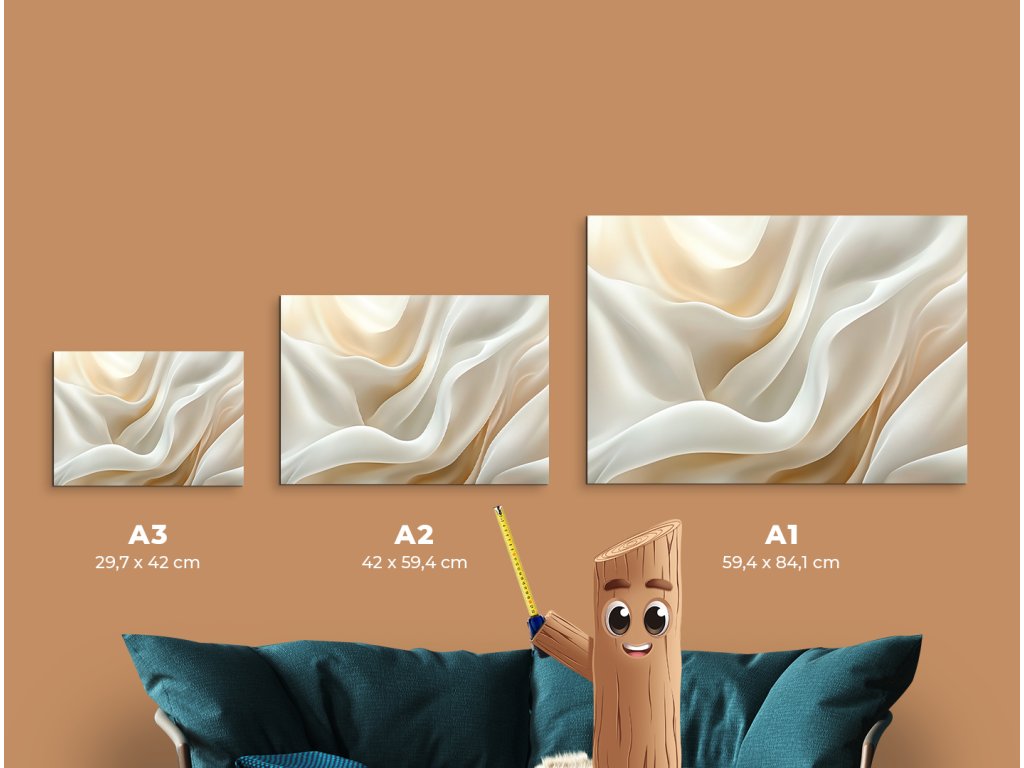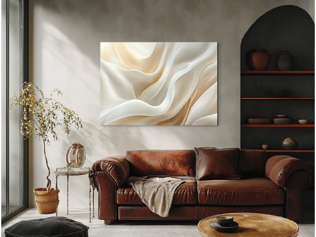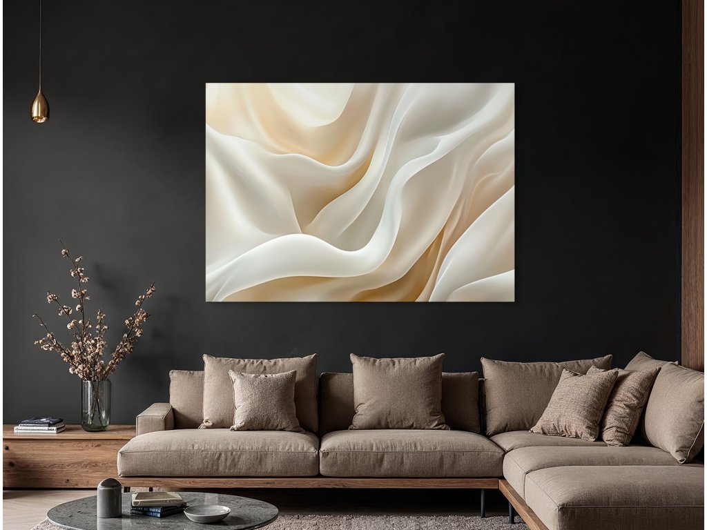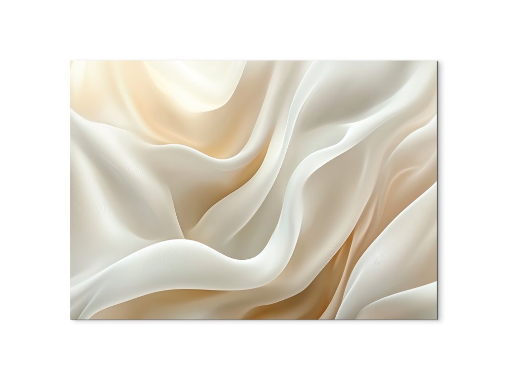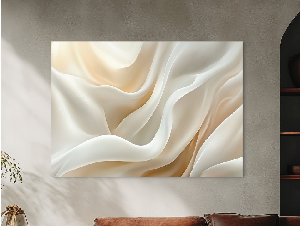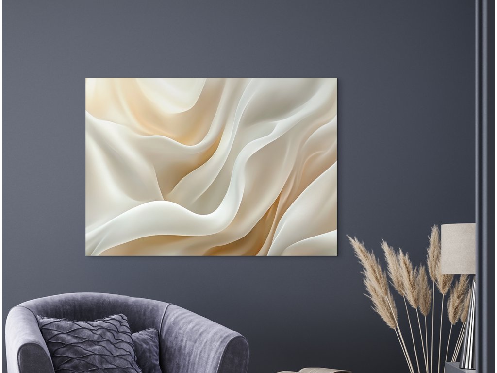 Abstraktní obraz s jemnými, plynulými formami v odstínech bílé, krémové a světle zlaté vytváří dojem splývavé látky či pískových dun. Kompozice působí klidně a elegantně, evokuje lehkost, ticho a přirozený pohyb.