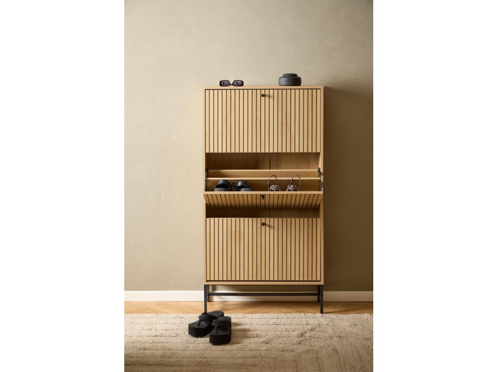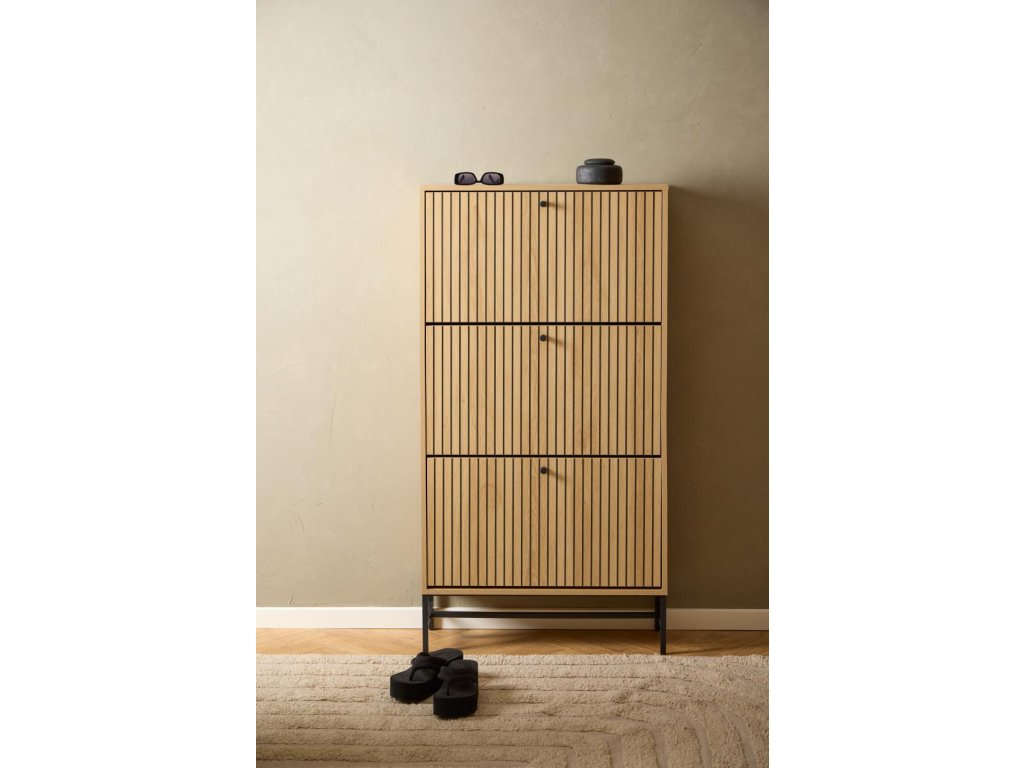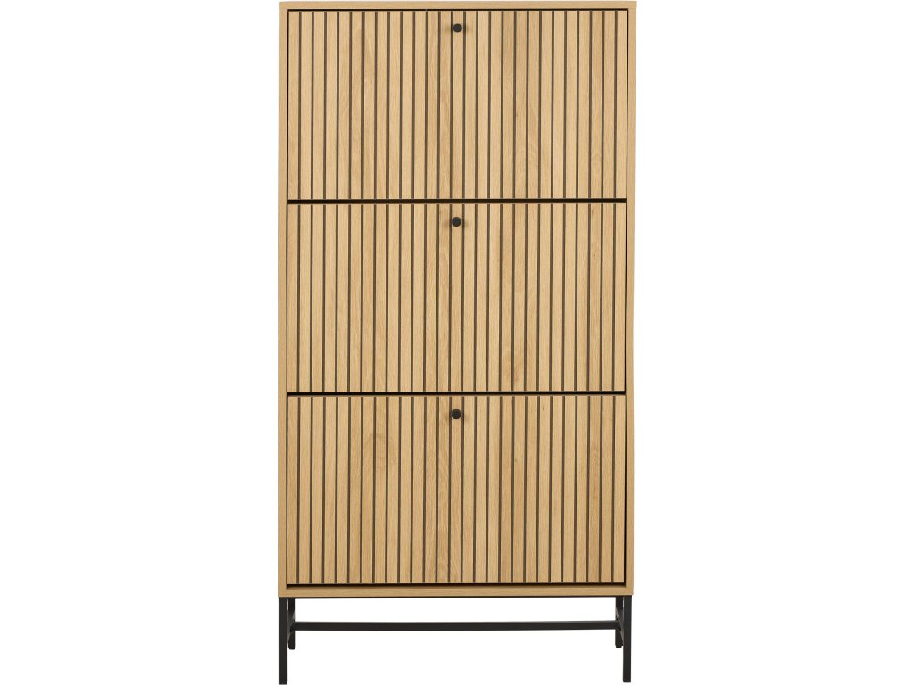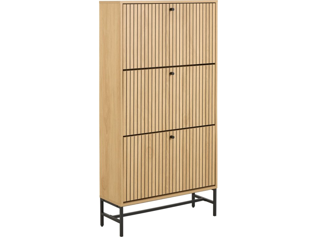 Stylová skříňka na boty Albany A s lamelovým čelem v dekoru divokého dubu a černou kovovou podnoží. Obsahuje 3 výklopné zásuvky pro přehledné a diskrétní uložení bot. Díky svému úzkému profilu se ideálně hodí do chodby či vstupního prostoru.