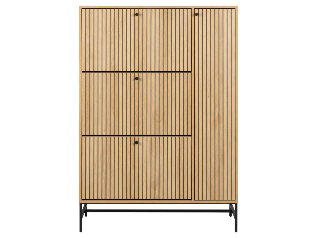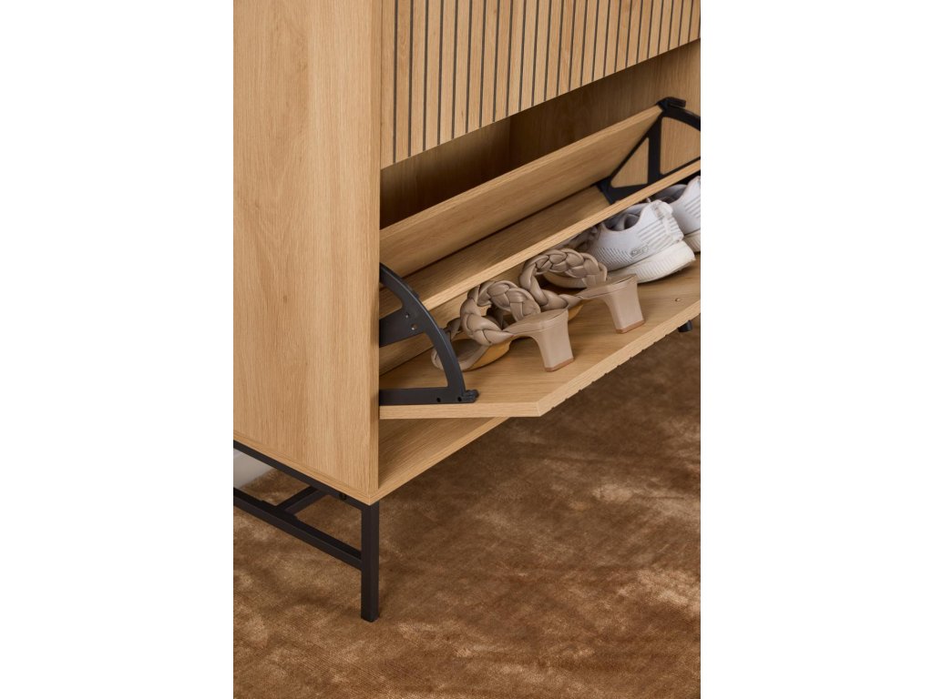 Skříňka na boty Albany B nabízí vysokou kapacitu úložného prostoru v moderním designu. Kombinace dubového dekoru a černé oceli vytváří industriální vzhled. Tři zásuvky poskytují dostatek místa pro obuv. Ideální do vstupní haly.