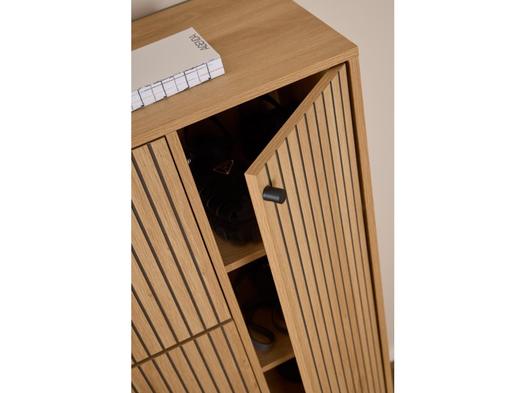 Botník Albany B vyniká moderním designem, který propojuje přírodní vzhled dubu s výraznými černými ocelovými prvky. Jeho lamelové čelo dodává nábytku estetickou strukturu a působí jako vizuální magnet. S rozměry 98,7 x 35 x 140,4 cm nabízí velkorysý úložný prostor v podobě 3 zásuvek a 3 otevřených polic, díky čemuž elegantně skryjete i větší počet bot. Geometrická ocelová základna s matným práškovým nástřikem nejen stabilizuje, ale zároveň podtrhuje moderní charakter celé kolekce.