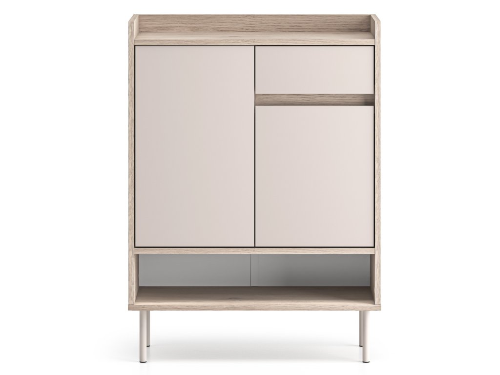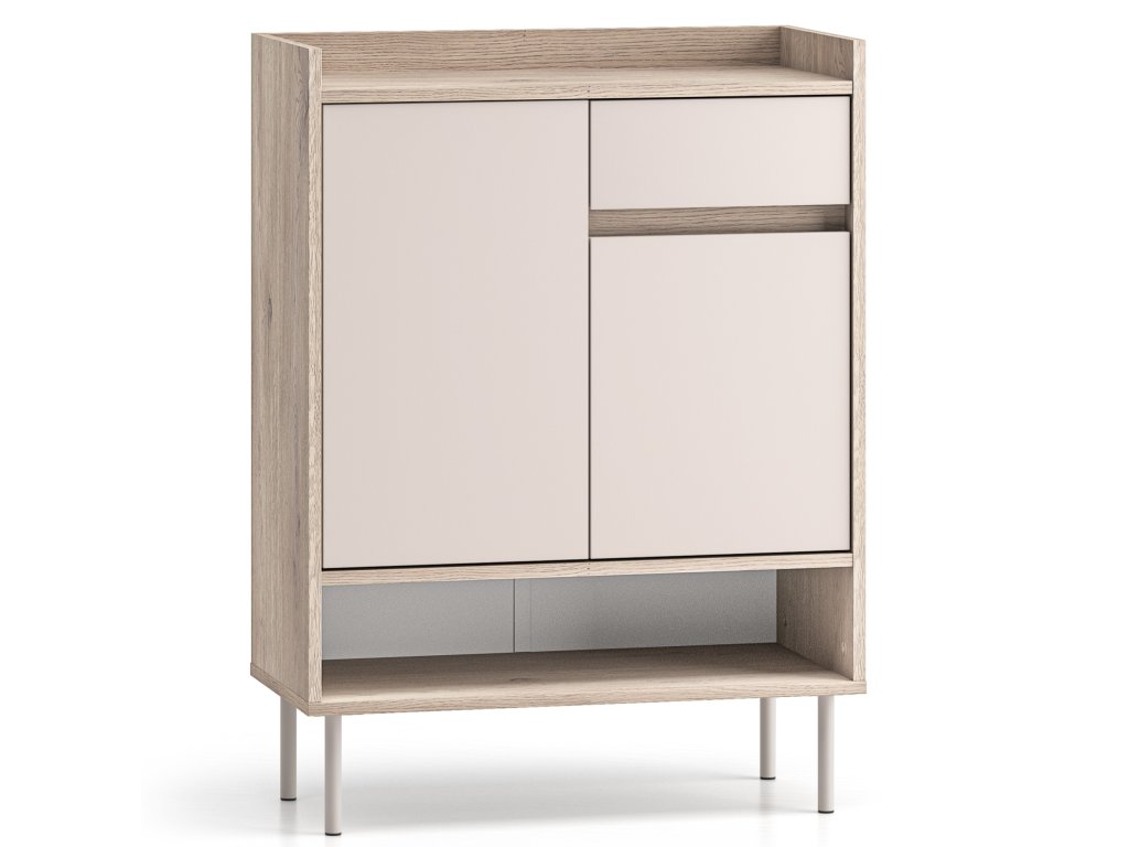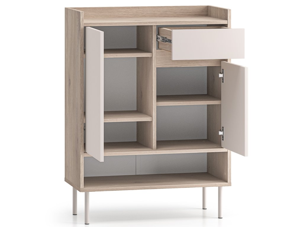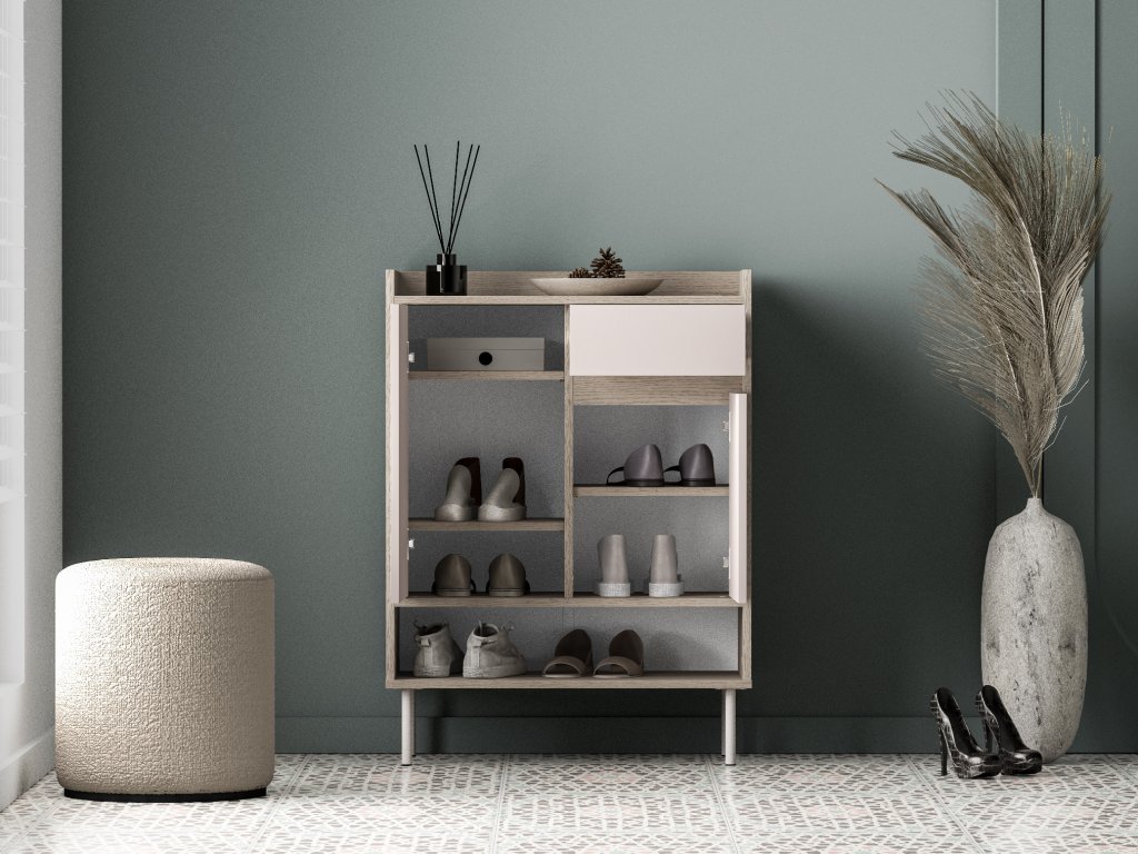 Praktický botník Voco 03 s 1 zásuvkou, 2 dvířky, 3 poličkami a spodní otevřenou policí. Elegantní kousek z kolekce Voco pro úhlednou předsíň.