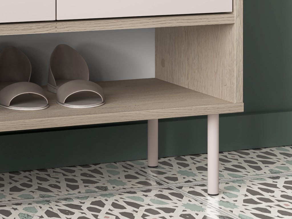 Elegantní zpracování v kombinaci kašmírových čel bez úchytek a dekoru dub krémový působí nadčasově a moderně. Botník stojí na vysokých kovových nohách v odstínu kašmíru, které mu dodávají lehkost a usnadňují úklid pod nábytkem. Samozřejmostí je tiché dovírání zásuvky i dvířek, díky čemuž je používání pohodlné a bezpečné.