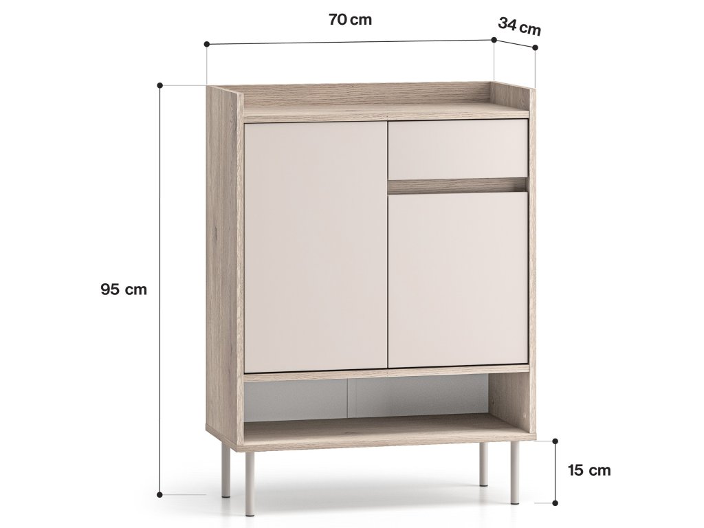 Botník Voco 03 je praktický pomocník do předsíně, který díky rozměrům 70 × 34 × 95 cm nabízí dostatek prostoru pro uskladnění obuvi i drobností. Disponuje dvojicí dvířek se skrytými poličkami, které pojmou více párů bot, jednou zásuvkou na drobné předměty a navíc i otevřenou policí ve spodní části, kde můžete pohodlně odložit často používanou obuv.