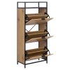 Skříňka na boty Seaford (56 × 30 × 129 cm) spojuje hřejivý vzhled divokého dubu s robustním ocelovým rámem v matné černé. Úzké, čtvercové nohy (výška 5 cm) odlehčují siluetu, zatímco hrubý práškový nástřik chrání kov před korozí i škrábanci. Tři přední klapky otevírají šest samostatných přihrádek, takže klidně uložíte celou kolekci tenisek, lodiček či dětských bot a chodba zůstane vždy uklizená.