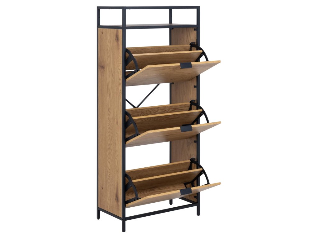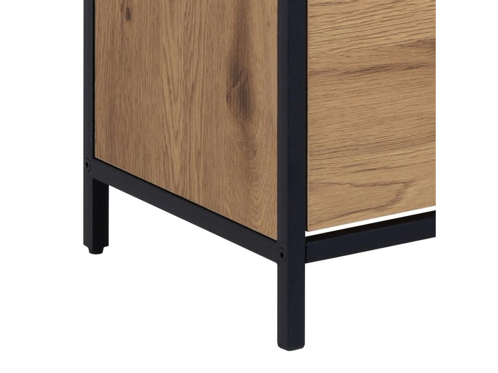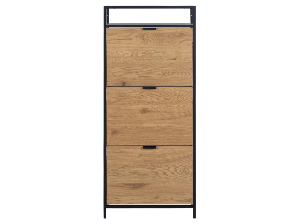 Stylový a funkční botník Seaford v moderním industriálním stylu je ideální pro organizaci obuvi. Kombinace matné černé oceli a divokého dubu přináší kontrast a přirozenost. Nabízí tři praktické zásuvky a otevřenou přihrádku – vše pěkně po ruce.