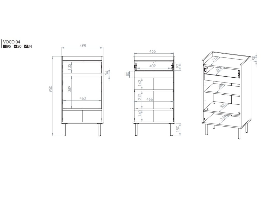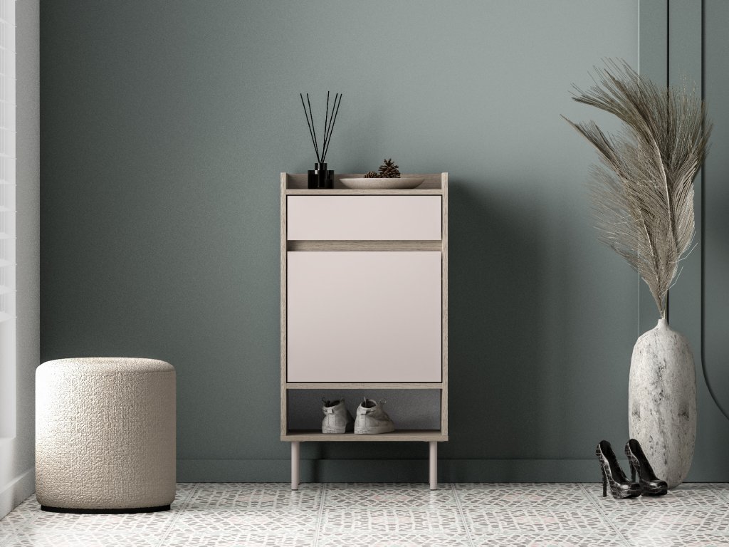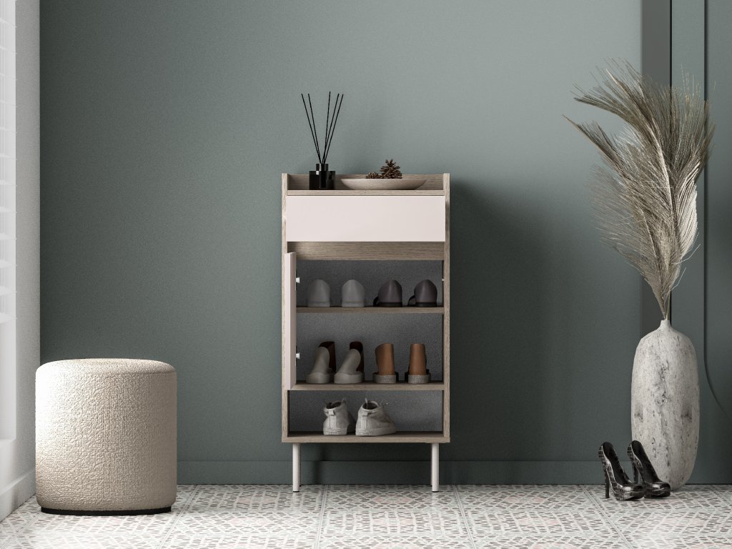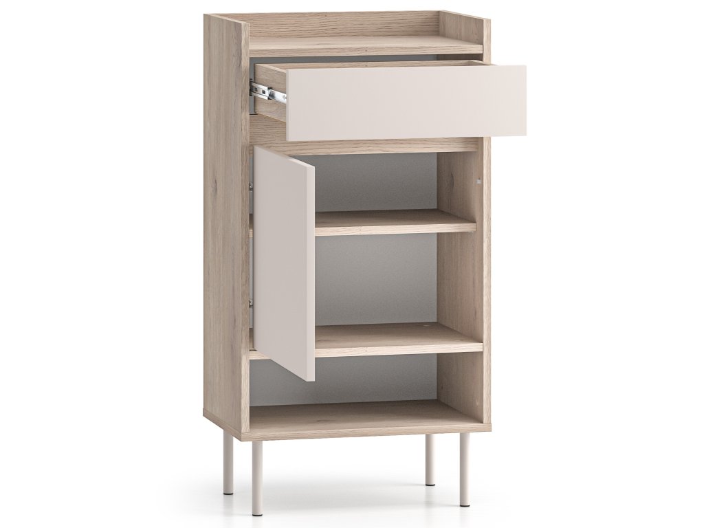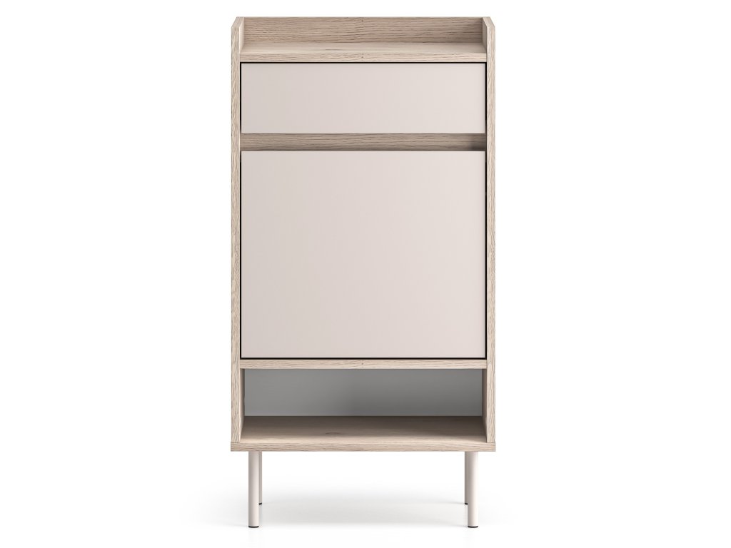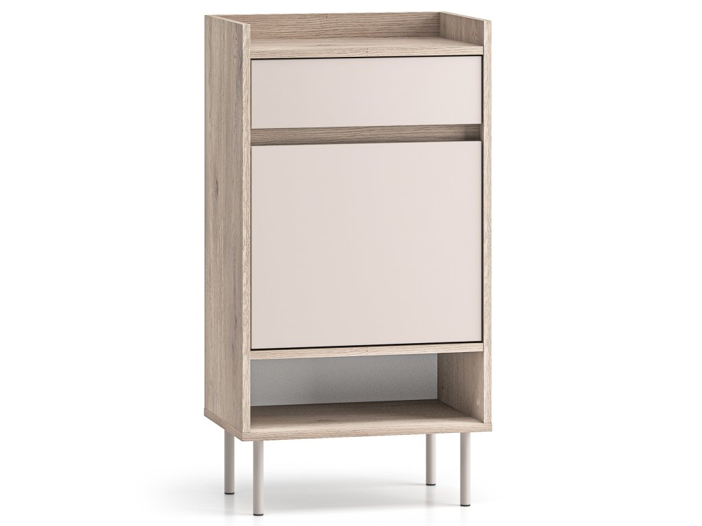 Kompaktní botník Voco 04 s 1 zásuvkou, 1 dvířky a 1 otevřenou policí. Praktické řešení z kolekce Voco do menších síní.