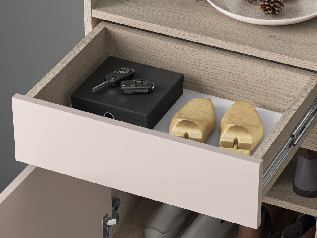 O pohodlí při používání se starají tiché mechanismy dovírání dvířek a plně výsuvné zásuvky, které zajišťují snadný přístup k obsahu. Nechybí ani praktické detaily jako výsuvný věšák, který usnadňuje manipulaci s oblečením.
