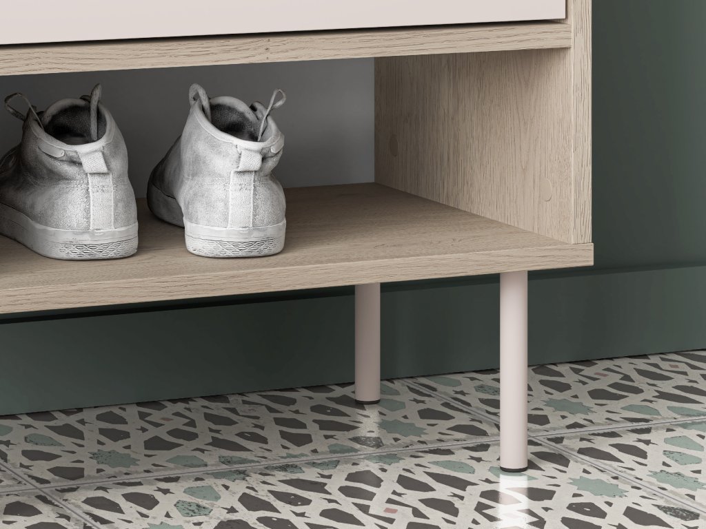 Elegantné kašmírové čelá bez úchytiek spolu s dekorom dub krémový vytvárajú moderný vzhľad, ktorý podčiarkujú vysoké kovové nohy v odtieni kašmíru. Vďaka mechanizmom tichého dovierania je používanie botníka pohodlné a bezpečné. Tento menší model sa perfektne hodí aj do užších priestorov, kde každý centimeter úložného priestoru hrá úlohu.