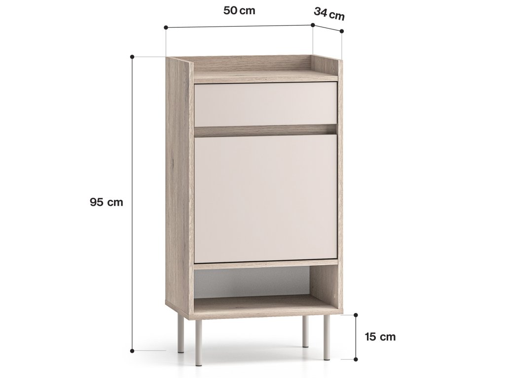 Botník Voco 04 je kompaktným riešením pre predsieň, ktoré ponúka funkčnú kombináciu úložných priestorov. Na ploche 50 × 34 × 95 cm disponuje jednými dvierkami so skrytou poličkou, jednou zásuvkou na drobnosti a otvorenou policou, ktorá je ideálna na odkladanie topánok alebo doplnkov, ktoré chcete mať hneď po ruke.