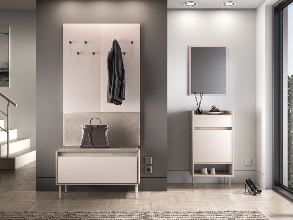 Nábytek z kolekce Voco je navíc doplněn o měkké béžové velurové čalounění na botnících a věšákových panelech, díky čemuž předsíň působí nejen funkčně, ale také funkčně, ale také funkčně, ale i stylově.