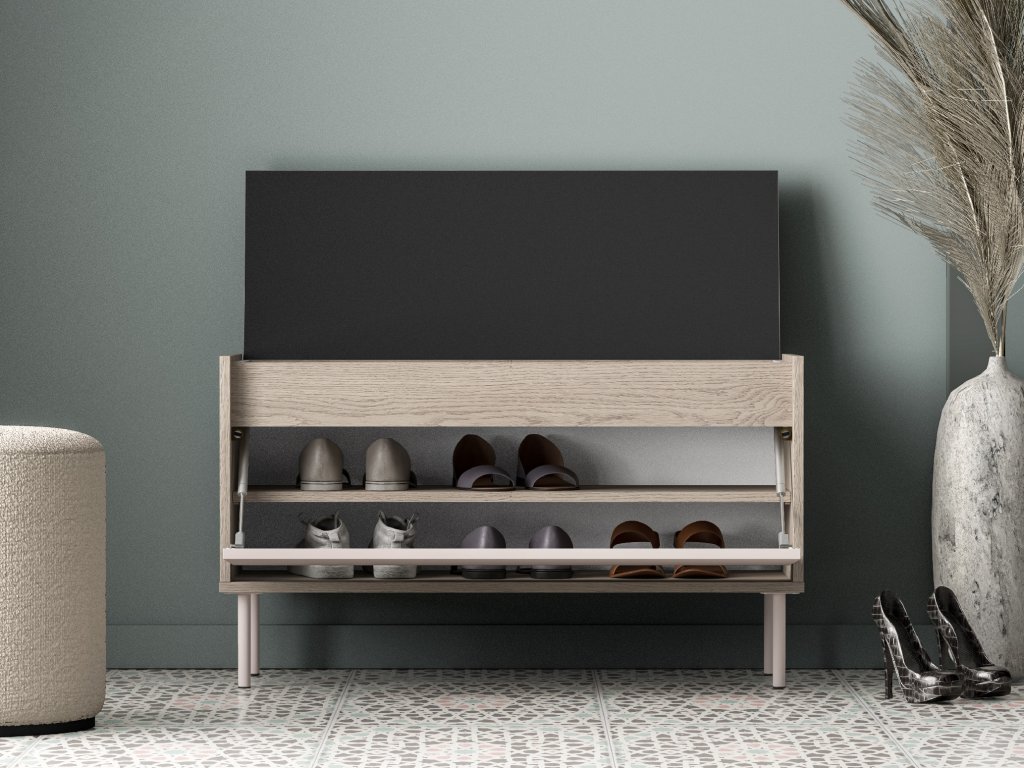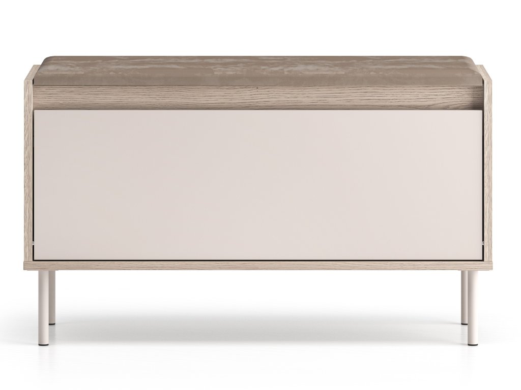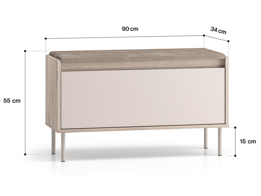 Botník Voco 05 spojuje praktické úložné řešení s pohodlným sezením. Na ploše 90 × 34 × 55 cm nabízí hned dva samostatné úložné prostory – pod vyklápěcími dvířky se ukrývá místo pro boty a pod zvedacím podsedákem další prostor pro doplňky či drobnosti. Podsedák je čalouněný měkkým béžovým velurem, který je příjemný na dotek a zvyšuje komfort používání.