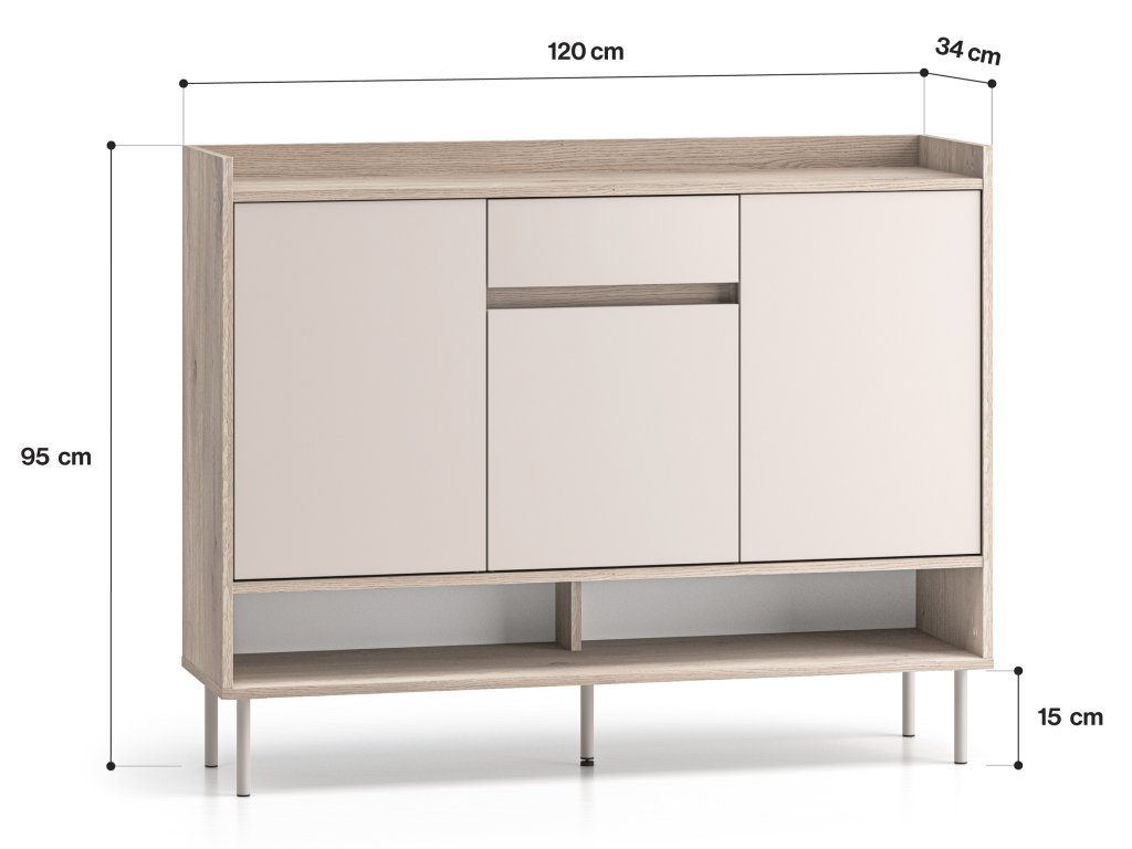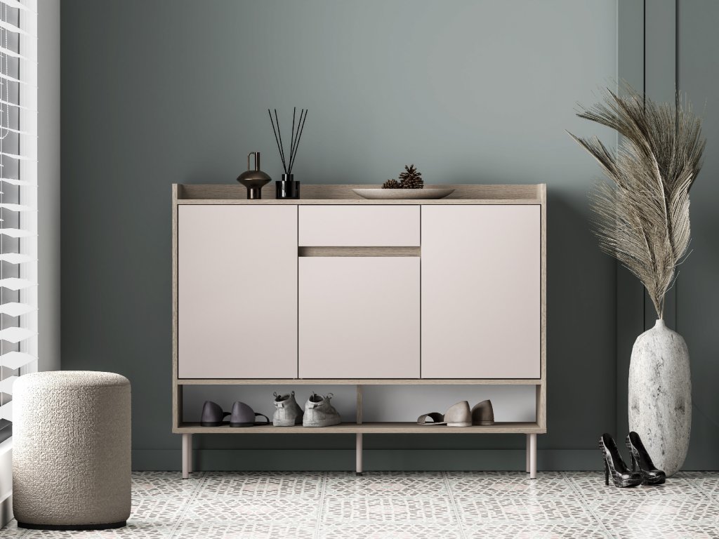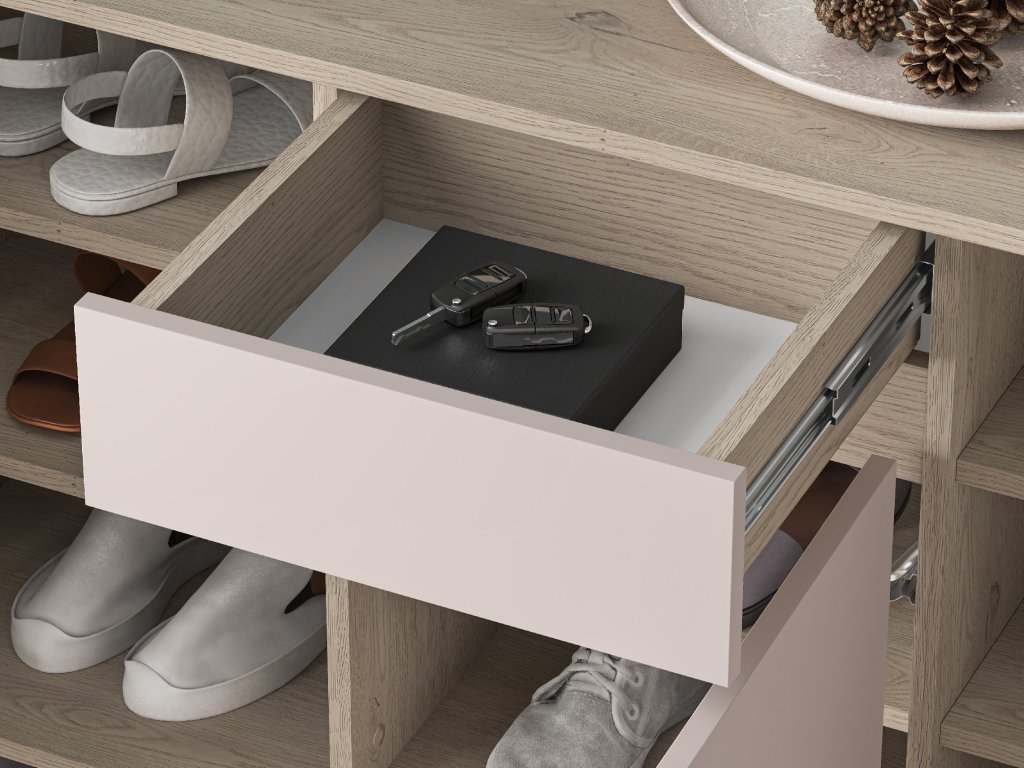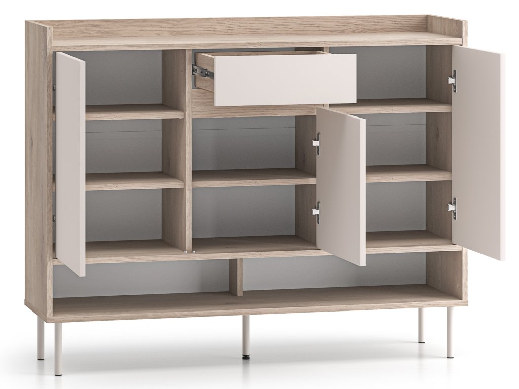 Minimalistické kašmírově béžové fronty bez úchytek doplněné o dekor dub krémový působí stylově a nadčasově. Botník stojí na vysokých kovových nohách v odstínu kašmíru, které dodávají nábytku lehkost a usnadňují úklid pod ním. Samozřejmostí je také tiché dovírání dvířek a zásuvky, které zvyšuje komfort každodenního používání.