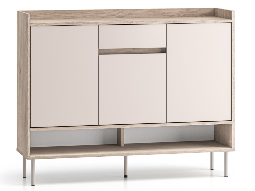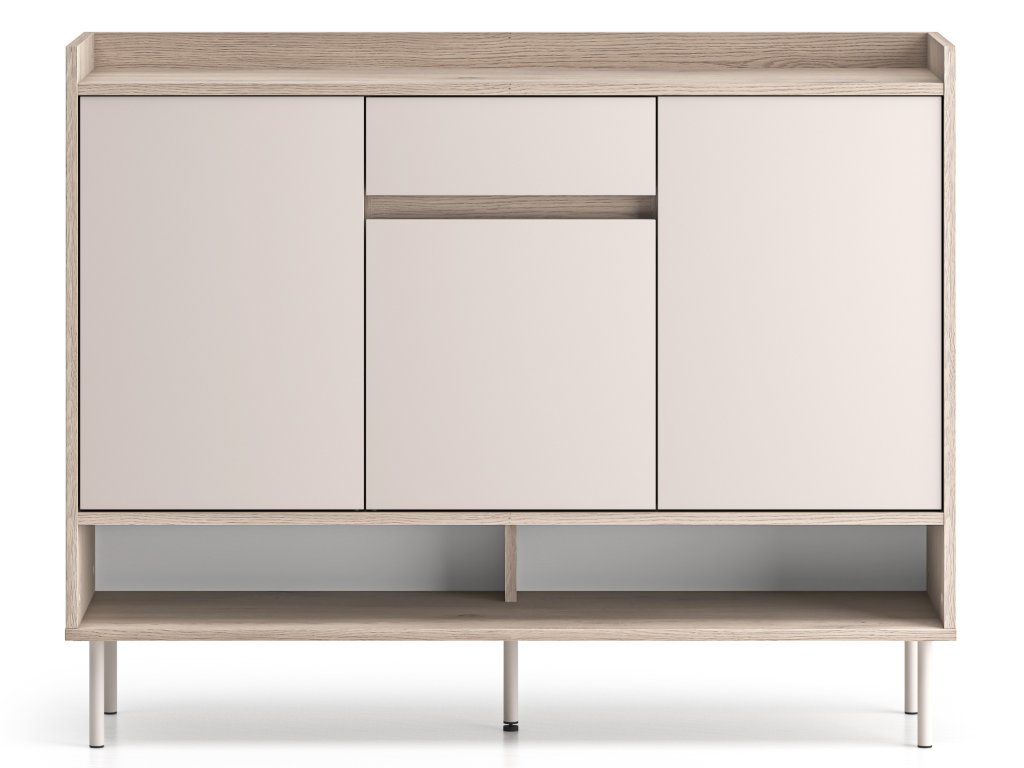 Kolekce Voco spojuje moderní eleganci s praktickým řešením pro každodenní používání. Jemné béžové (kašmírové) fronty se krásně doplňují s teplým dekorem dub krémový, zatímco vysoké kovové nohy v odstínu kašmíru dodávají nábytku lehkost a vzdušnost. Minimalistický vzhled podtrhují přední čela bez úchytek. Kolekce Voco je vyrobena z 16 mm laminované desky s odolnými ABS hranami, doplněná o bílé HDF zadní panely.