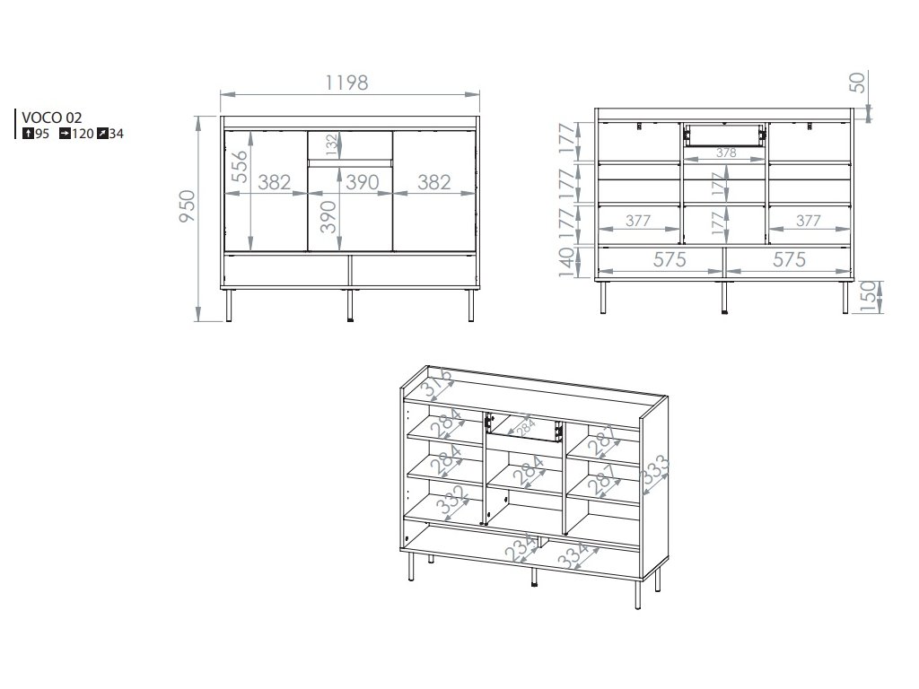 Botník Voco 02 nabízí praktické řešení pro uskladnění většího množství obuvi a zároveň působí elegantně a moderně. S rozměry 120 × 34 × 95 cm poskytuje dostatek prostoru díky 6 poličkám ukrytým za trojicí dvířek. Kromě toho je vybaven také jedno menší zásuvkou, která je ideální pro uložení drobných předmětů, jako jsou klíče, kartáče na boty nebo jiné doplňky.