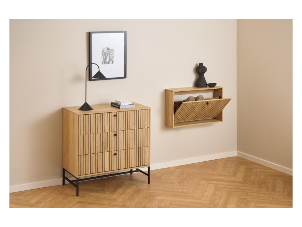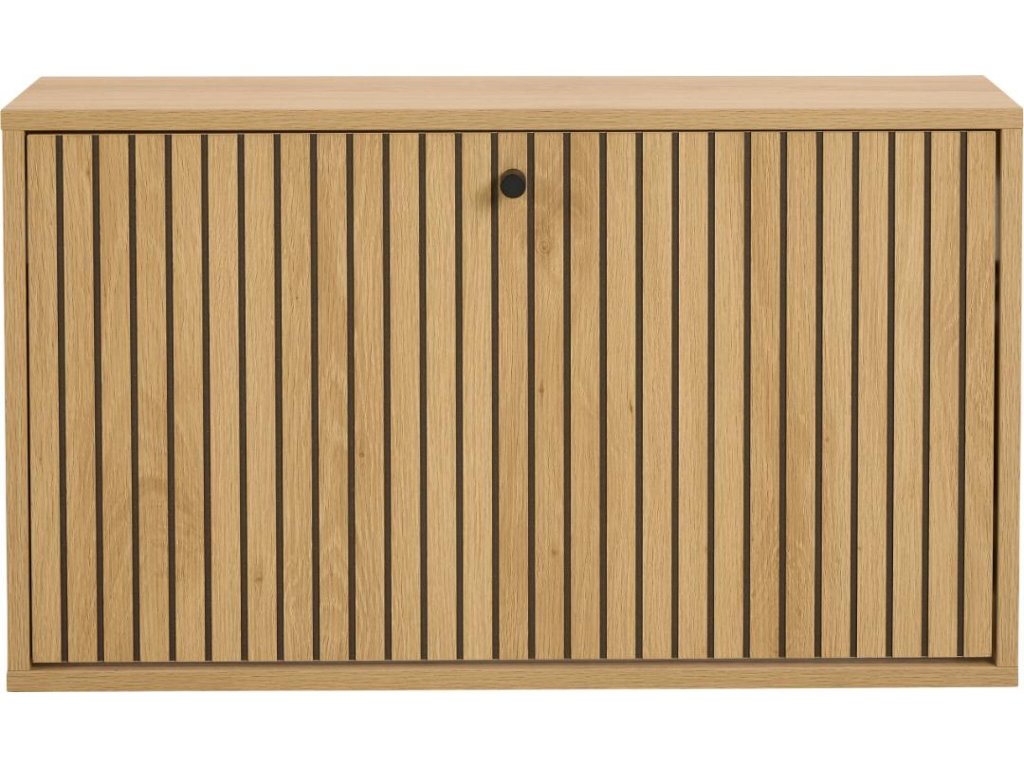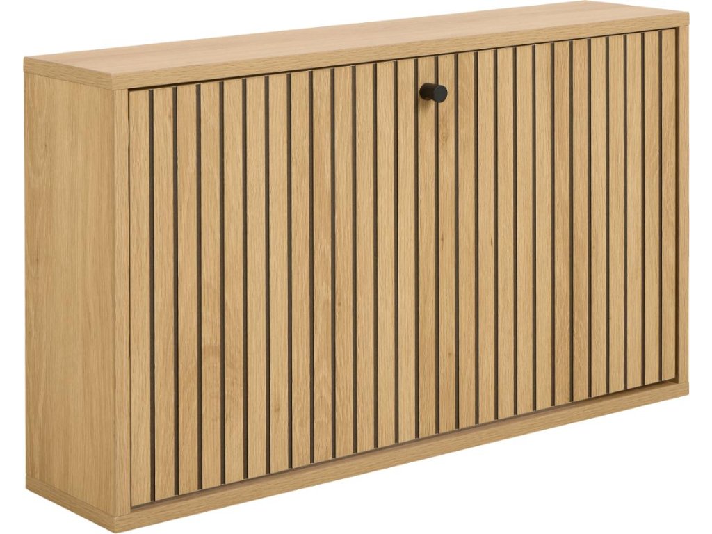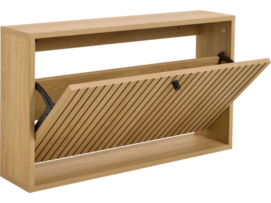 Kompaktní skříňka na boty Albany s lamelovým čelem v dubovém dekoru. Montáž na zeď šetří místo a zajišťuje čistý vzhled. Ideální do menších chodeb.
