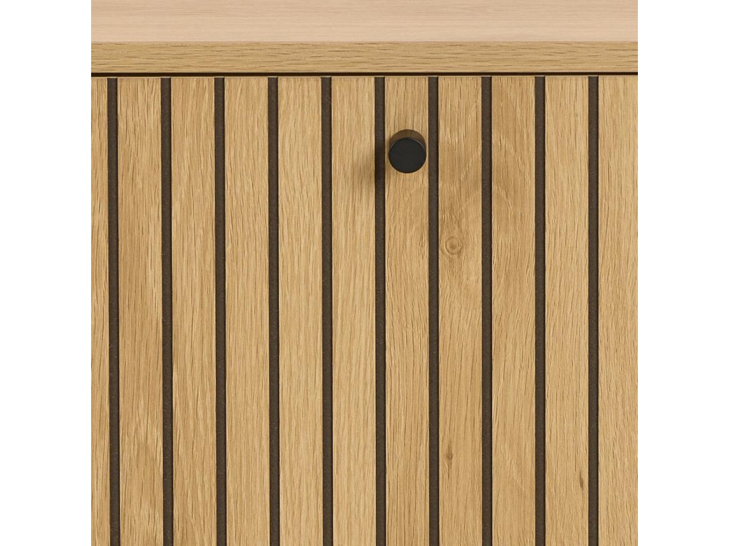 Jedna výklopná zásuvka slouží jako praktický úložný prostor pro boty či drobnosti, které chcete udržet mimo dohled. Kombinace přírodního vzhledu dřeva s černými detaily působí vyváženě a moderně.
