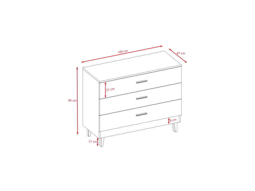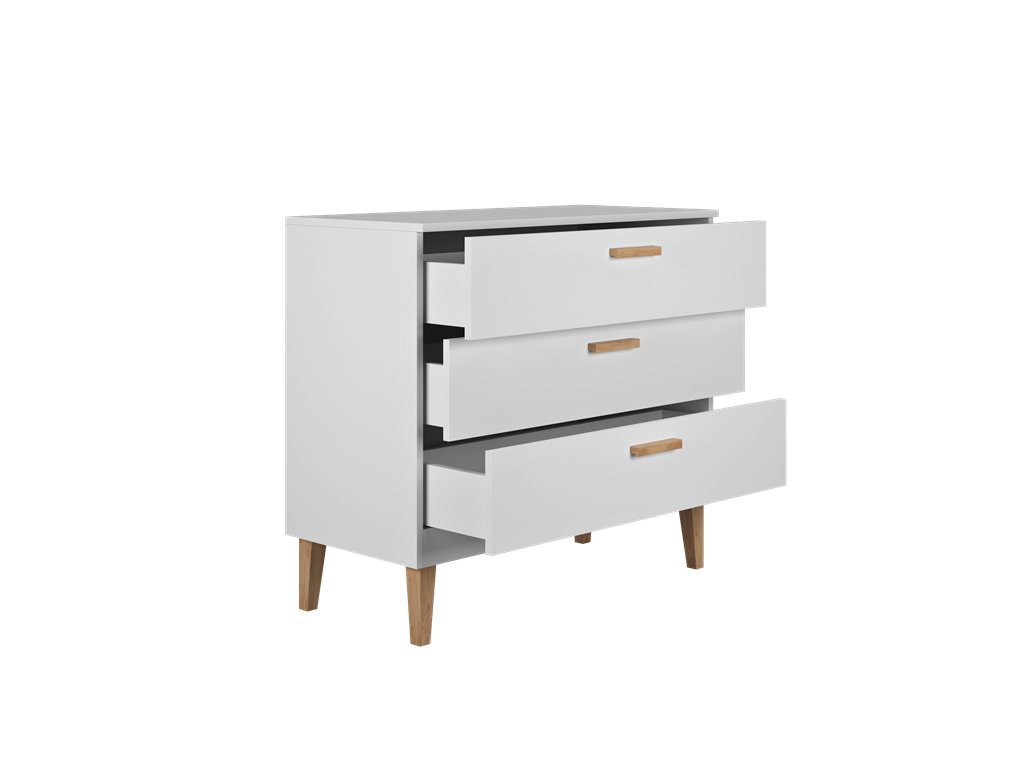 Komoda je vyrobena z laminované dřevotřísky bílé barvy (18 mm). Komodu doplňují nohy a madla z masivního dubového dřeva, natřené ekologickým bezbarvým lakem. Praktičnost stylu a designu komody se hodí do různých interiérů. Pro bezpečnost dětí má komoda speciální úhlové držáky pro montáž na zeď, což zvyšuje její stabilitu. Pro snazší montáž je komoda dodávána s obrázkovým návodem.