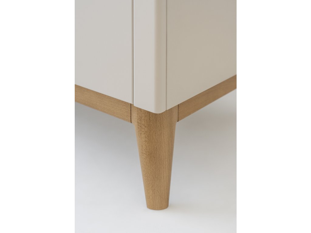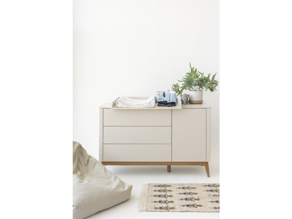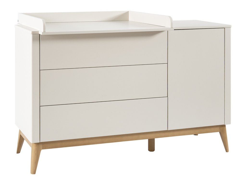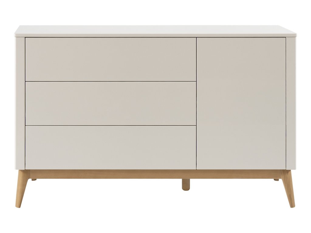 Široká komoda Seth s 3 zásuvkami a jedněmi dvířky nabízí spoustu prostoru pro oblečení či hračky. Elegantní kombinace béžového a bukového dřeva se hodí do každého dětského pokoje.