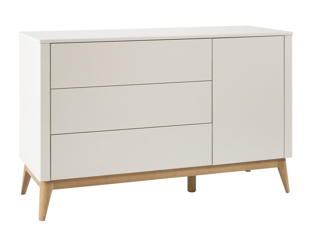 Široká komoda Seth je praktickým řešením pro všechny rodiče, kteří potřebují kombinaci úložného prostoru se zásuvkami i uzavřenou skříňkou. Vybavena je třemi prostornými zásuvkami a jedněmi dvířky, takže poskytuje dostatek místa na oblečení, hračky či dětské doplňky.