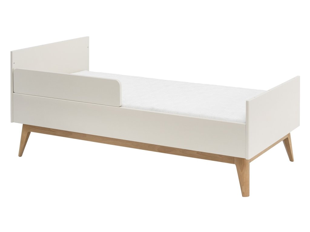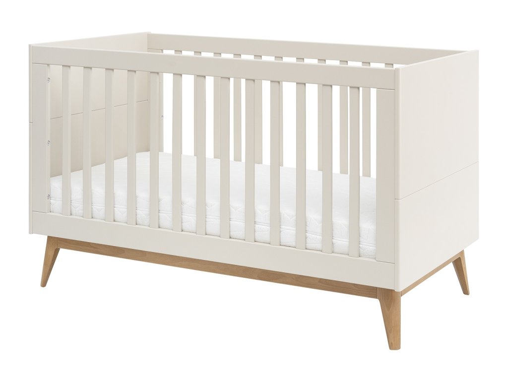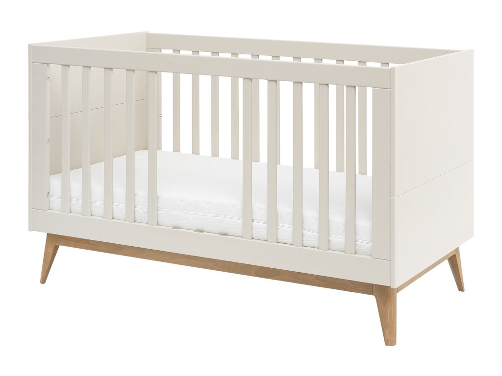 Bezpečná a prostorná postýlka s jemným designem v béžové a bukovém dřevě. Poskytuje více místa pro pohodlný spánek miminek i batolat a patří do nadčasové kolekce Seth.
