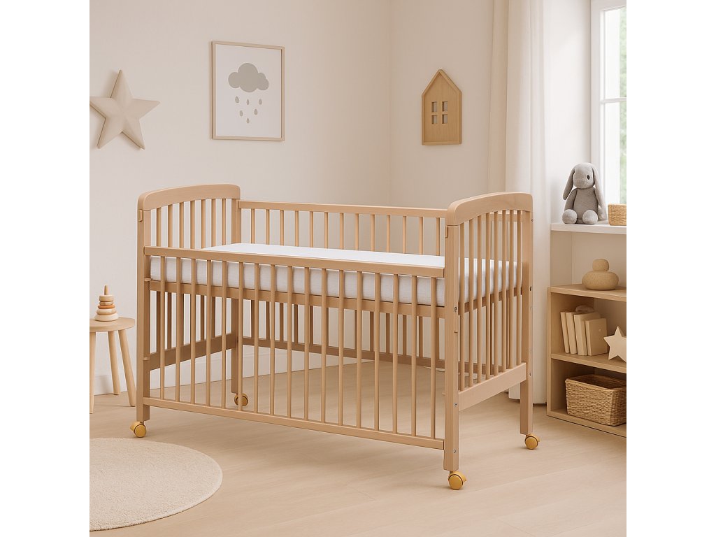 Dětská dřevěná postýlka je vyrobená z kvalitního bukového masivu bez povrchové úpravy. Má klasický tvar s možností stahování boční strany. Je bezpečná i stabilní a zaručuje bezpečný spánek pro děti do 3 let.