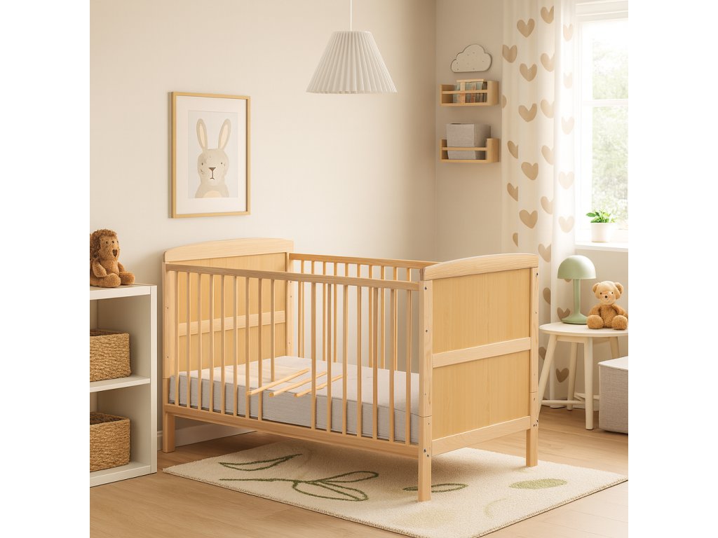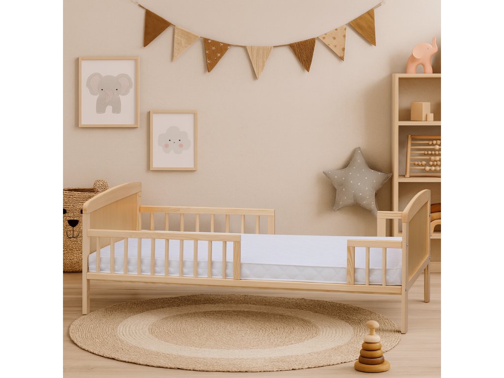 Dětská postýlka z borovicového masivu poroste spolu s vaším dítětem. Dá se nastavit do dvou poloh a obsahuje vyjímatelné příčky. Velikost postýlky umožňuje její používání až do 6 let dítěte.