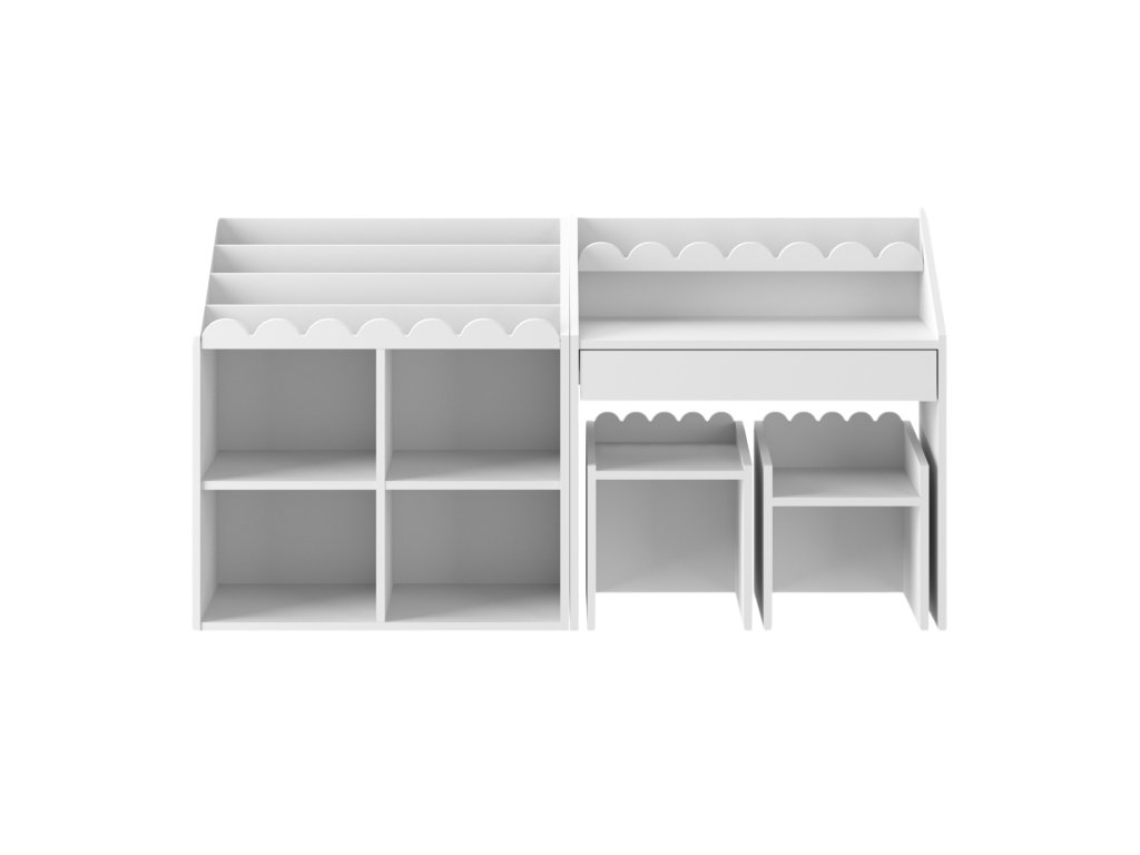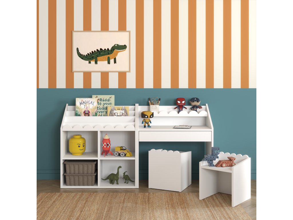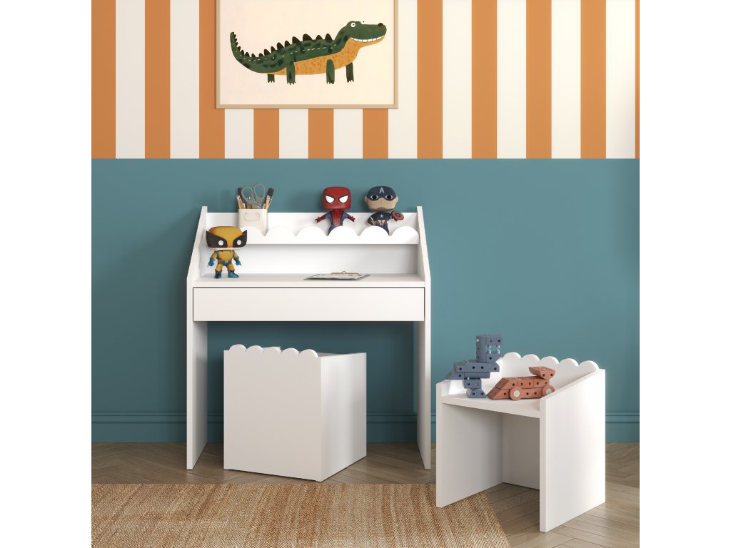Bílý Montessori dětský stolek Nook je univerzální, světlý a výborně se hodí do každého interiéru. Jeho neutrální barva podporuje soustředění a čistý design. Skvěle se kombinuje s barevnými i dřevěnými doplňky. Výborná volba do menších dětských pokojů.
