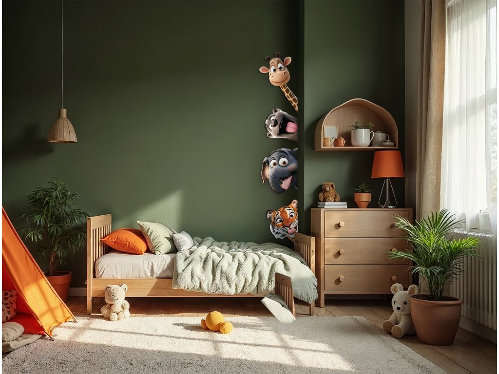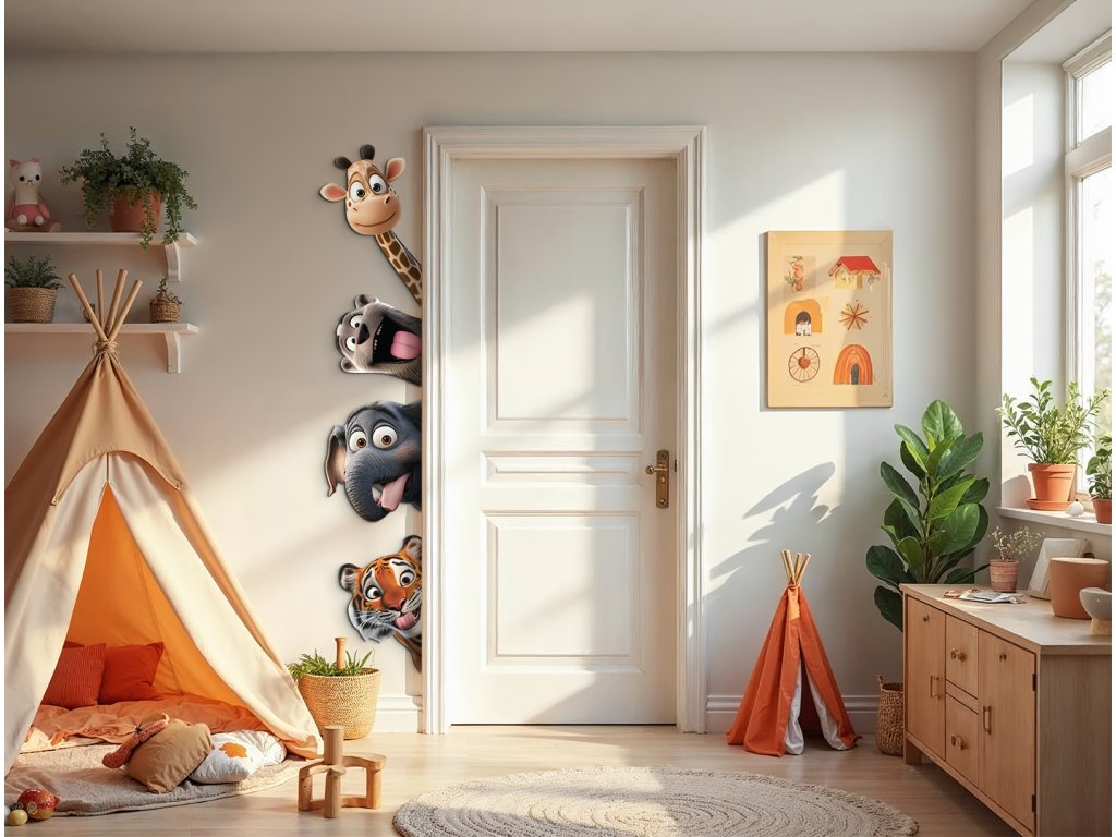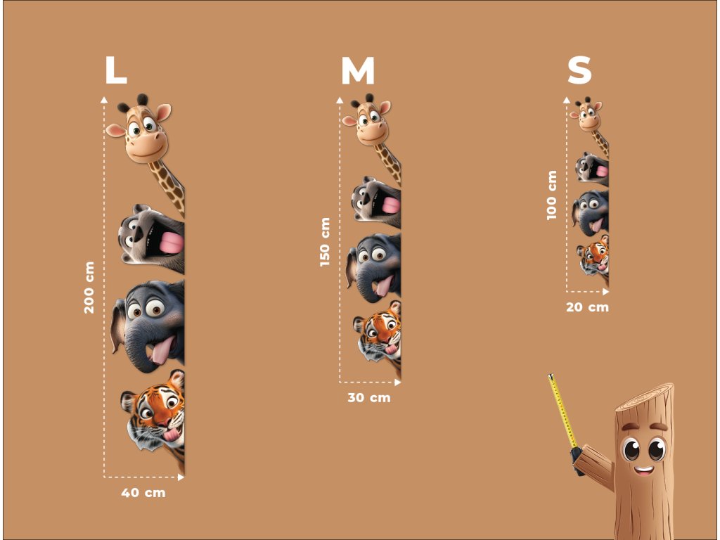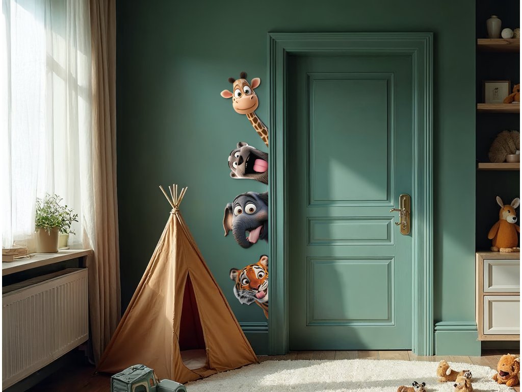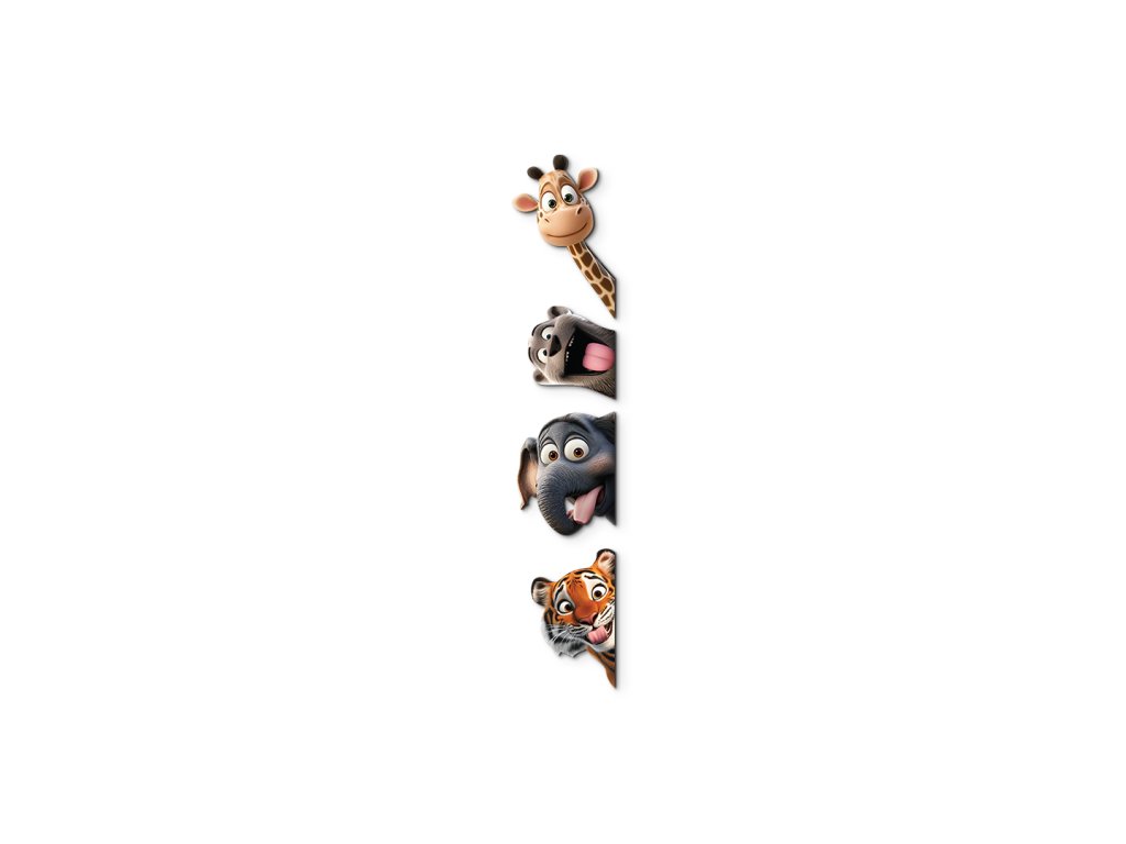 Hravá dekorace na zeď, na které veselá zvířátka vykukují například zpoza dveří s bláznivými výrazy a vyplazenými jazyky. Ideální doplněk do dětského pokoje, který rozesměje a oživí prostor zábavným abarevným motivem.
