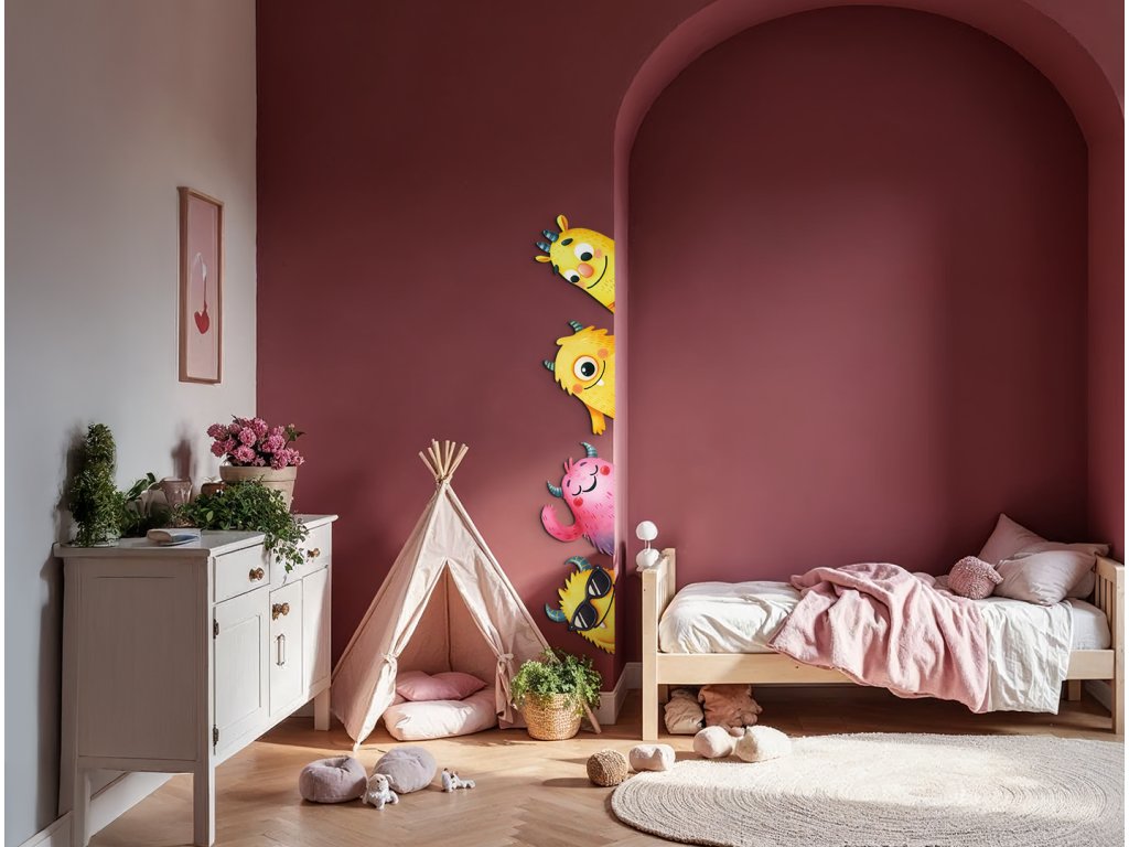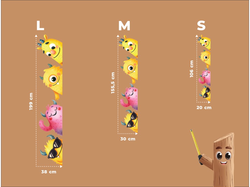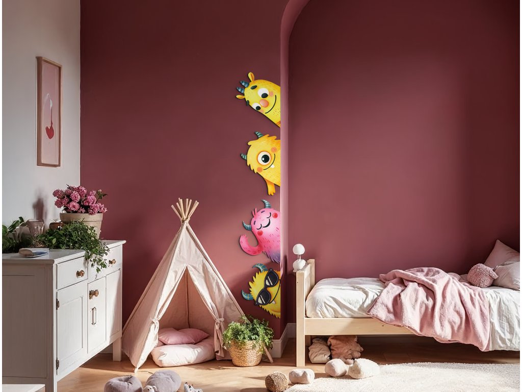 Veselá sada nálepek s barevnými příšerkami ve žlutých a růžových odstínech přinese do dětského pokoje hravost a zábavu. Postavičky jsou navrženy tak, aby vypadaly, že zvědavě vykukují zpoza dveří nebo z rohu místnosti.
