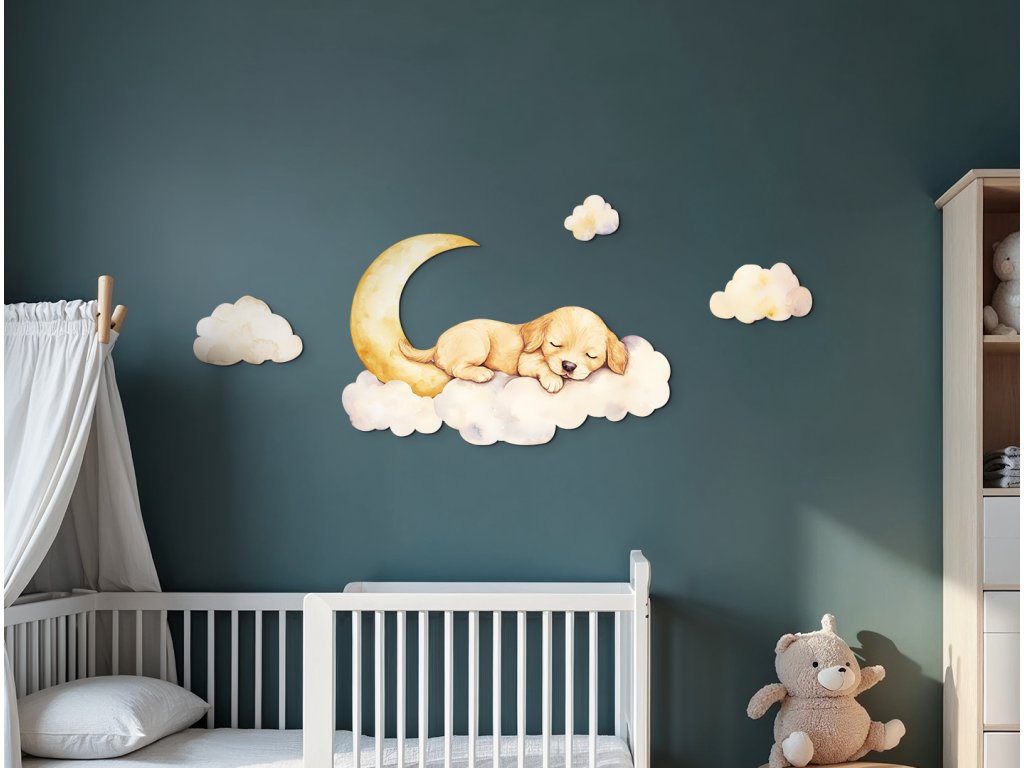 Na měkkém obláčku, pod září nočního měsíce, klidně odpočívá zlatý pejsek se snivým výrazem. Tato jemná ilustrace vytváří uklidňující atmosféru plnou ticha, bezpečí a dětské fantazie. Perfektní dekorace do pokojíčku pro klidné usínání.