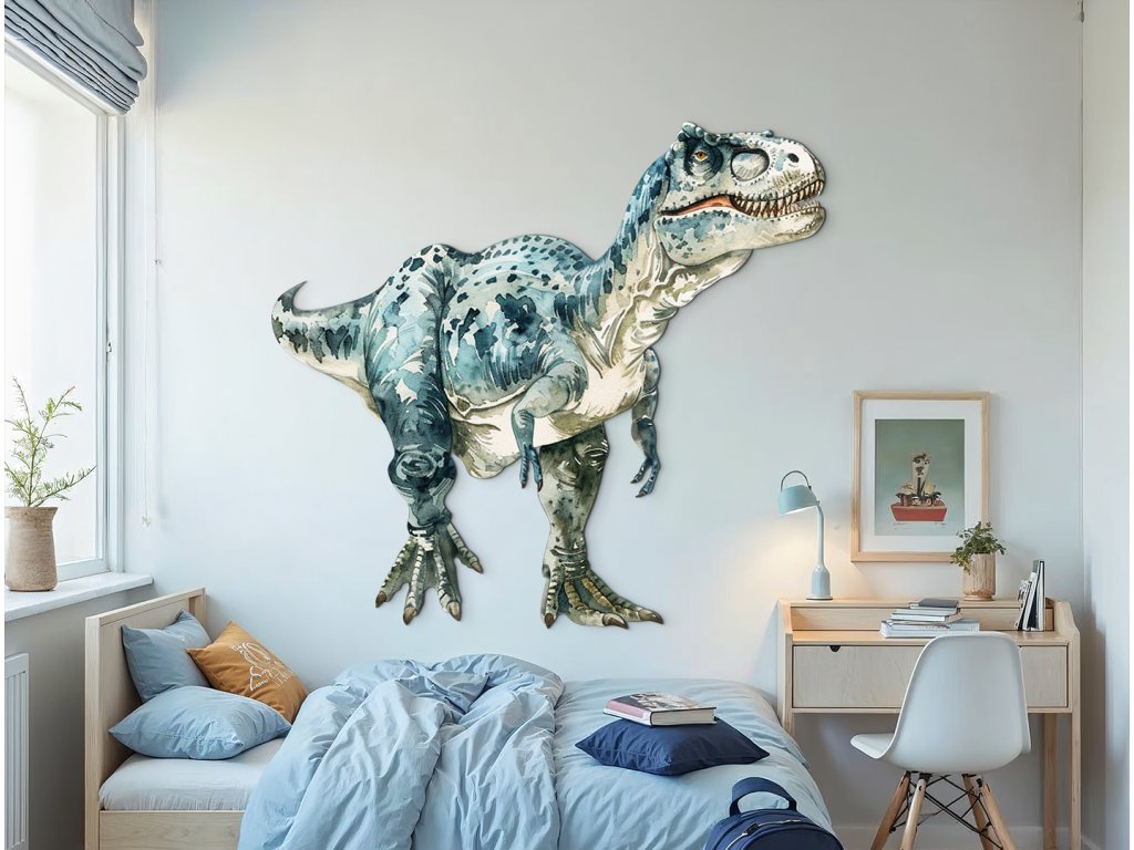 Na obrázku je alosaurus – velký masožravý dinosaurus, který žil před miliony let v období jury. Se silnými nohama, ostrými zuby a pohledem lovce působí působivě, ale v kreslené podobě je ideální i pro malé fanoušky dinosvěta. Perfektní doplněk na zeď do pokoje každého malého paleontologa!
