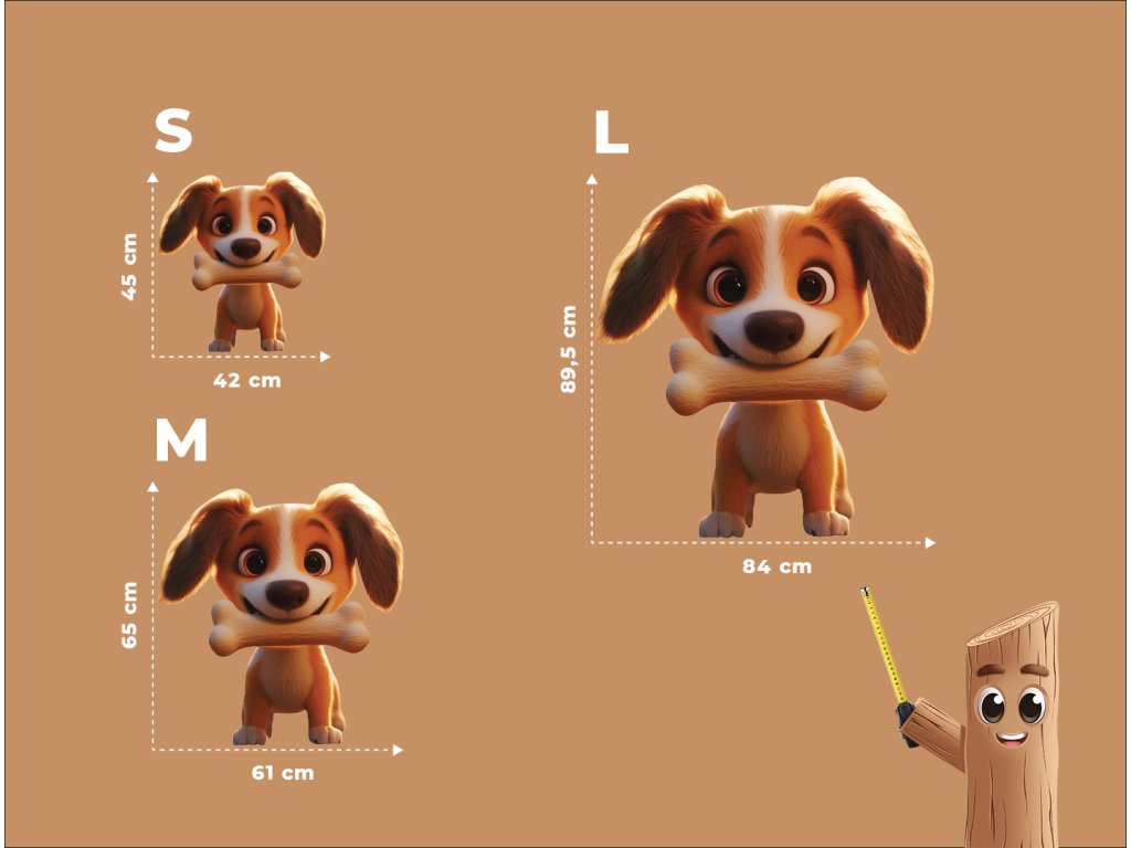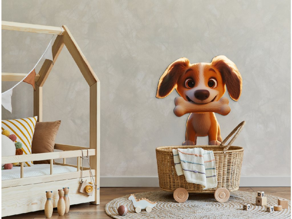 Tato roztomilá nástěnná dekorace zobrazuje animovaného pejska, který spokojeně drží svoji oblíbenou kost. Jemné linie a přátelský výraz dělají z tohoto motivu ideální doplněk do dětského pokoje. Skvěle se hodí pro malé milovníky zvířat a rozkošných ilustrací.