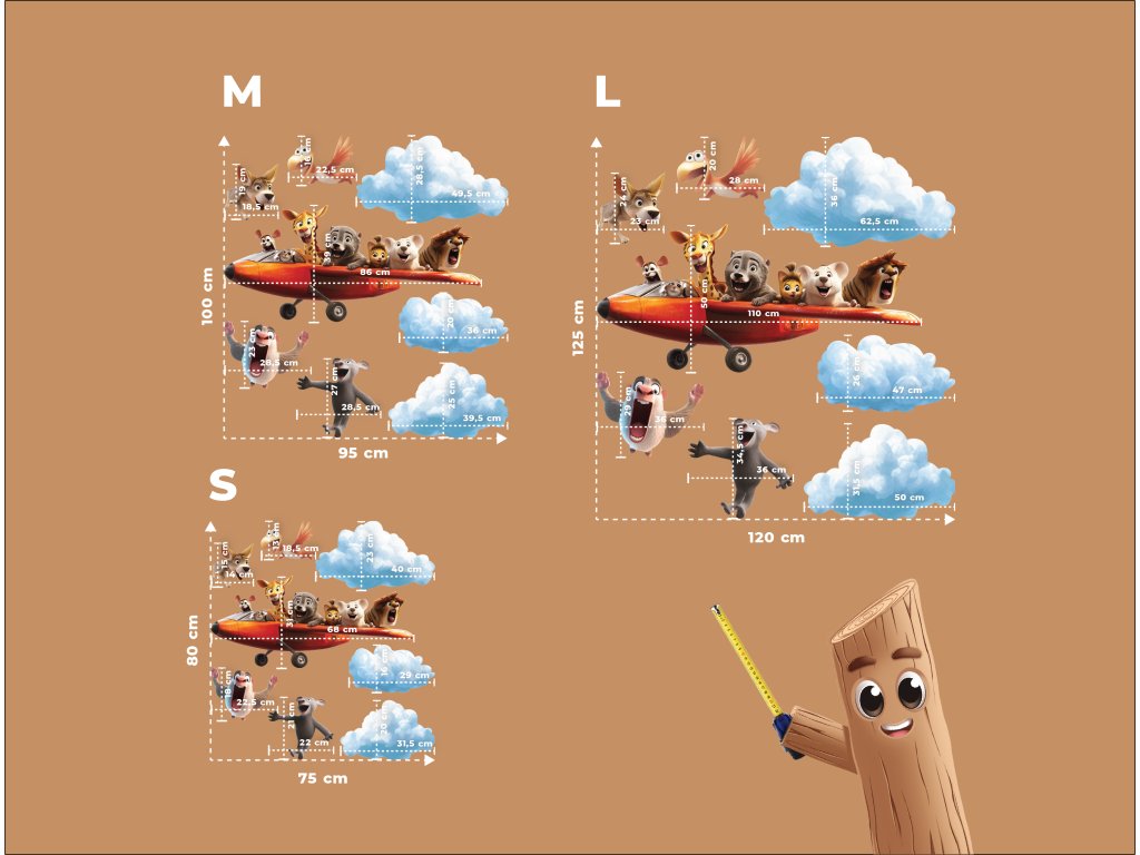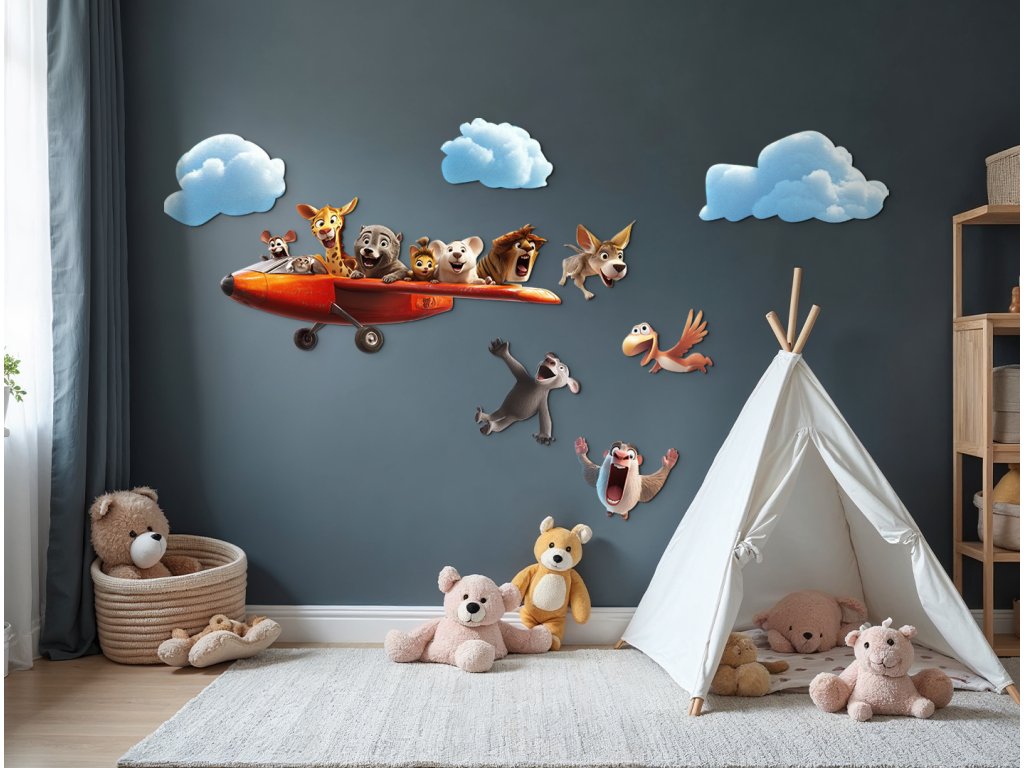 Veselá kreslená scéna červeného letadla, které letí mezi oblaky a veze rozmanitou partii zvířátek. Barevná a hravá animace přinese do dětského pokoje radost, fantazii a pocit dobrodružství. zvířátek.