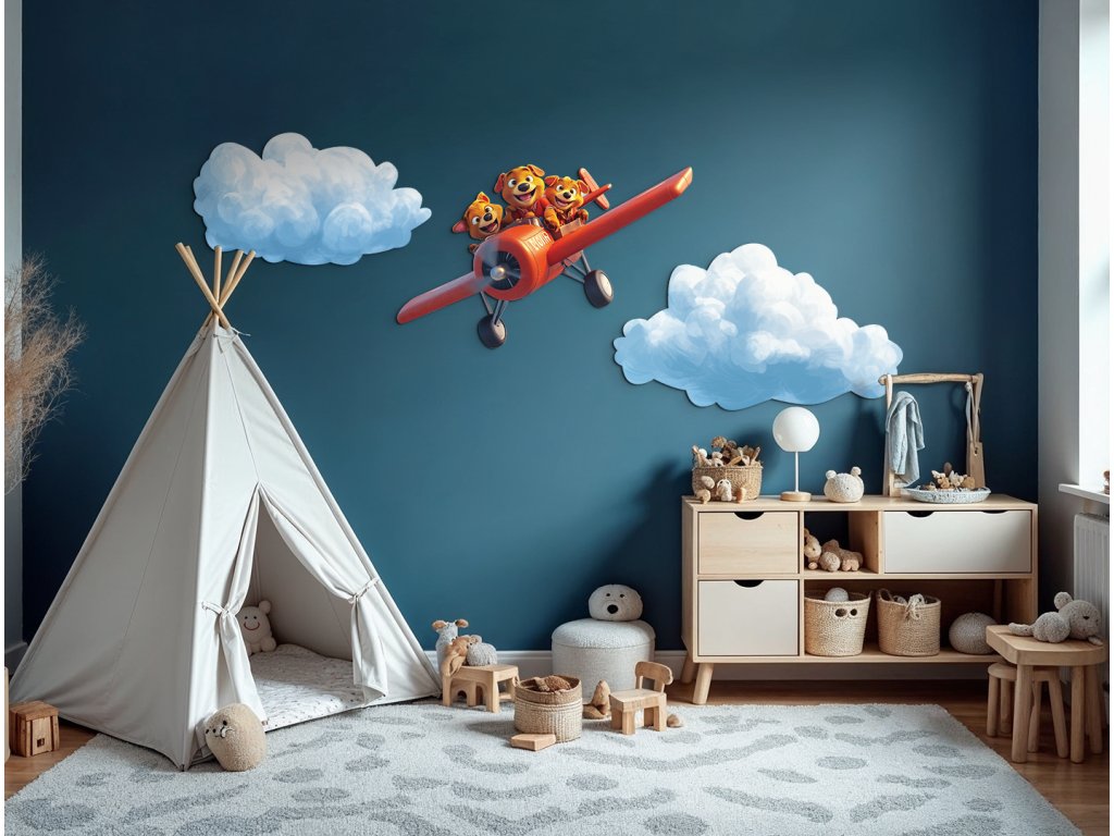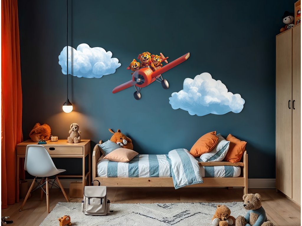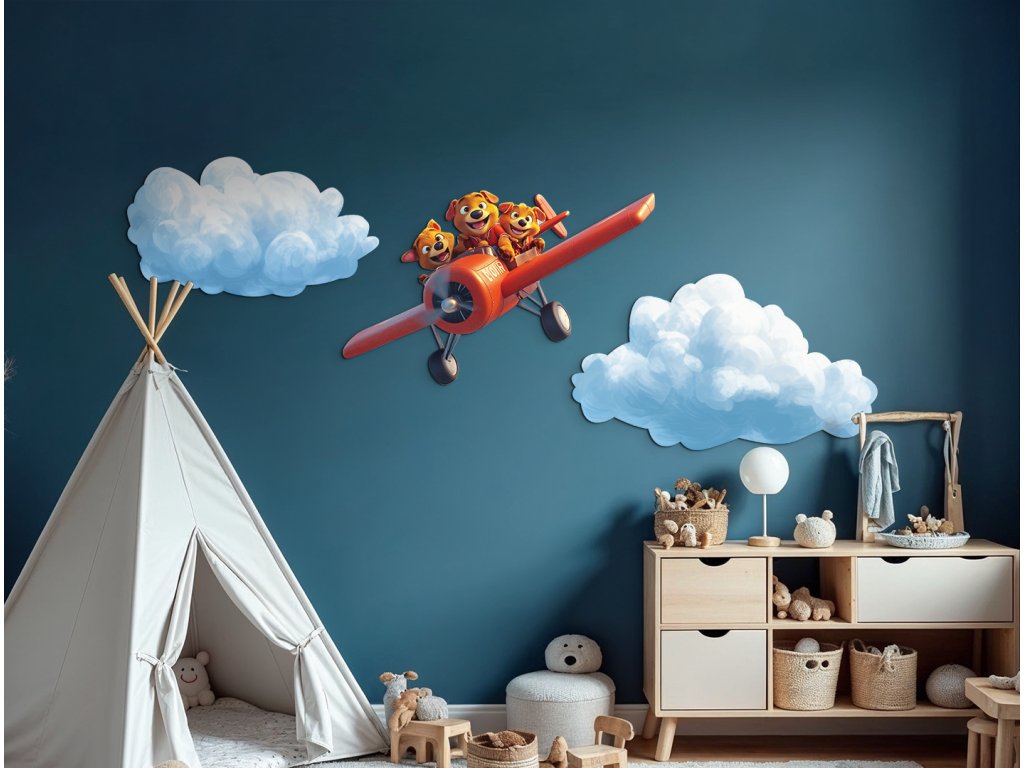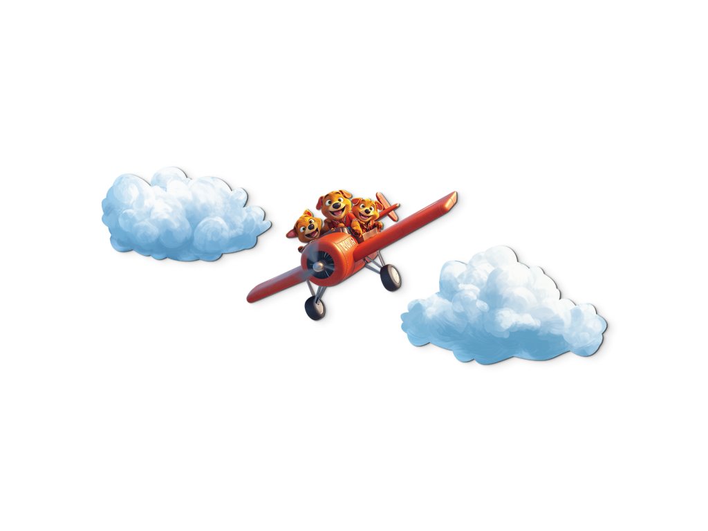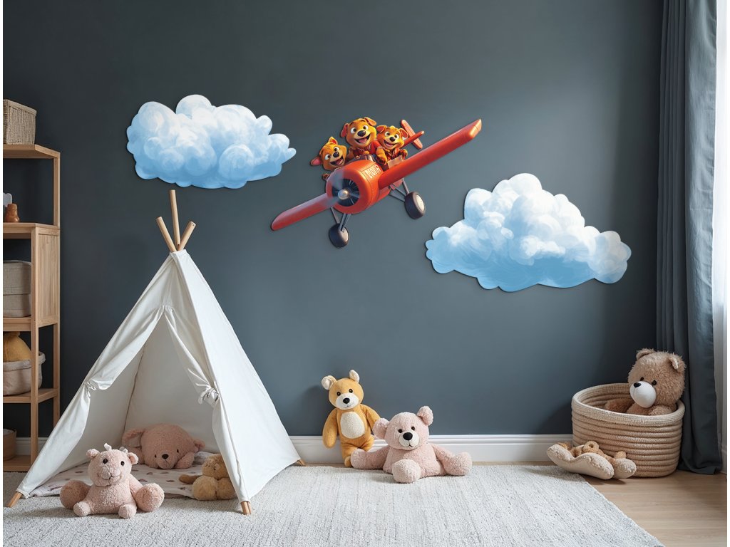Kdo řekl, že létat mohou jen lidé? Tato tři štěňátka v červeném letadle si to užívají naplno! Ideální obrázek pro veselou, dětskou atmosféru plnou smíchu a fantazie.