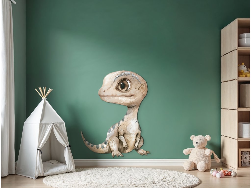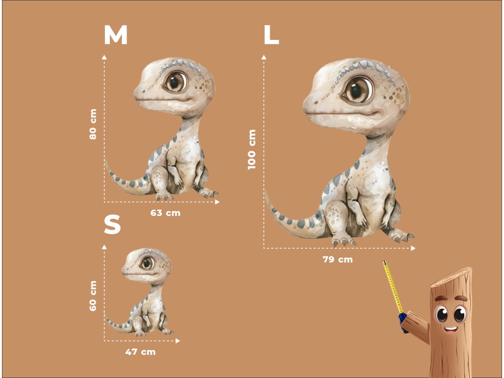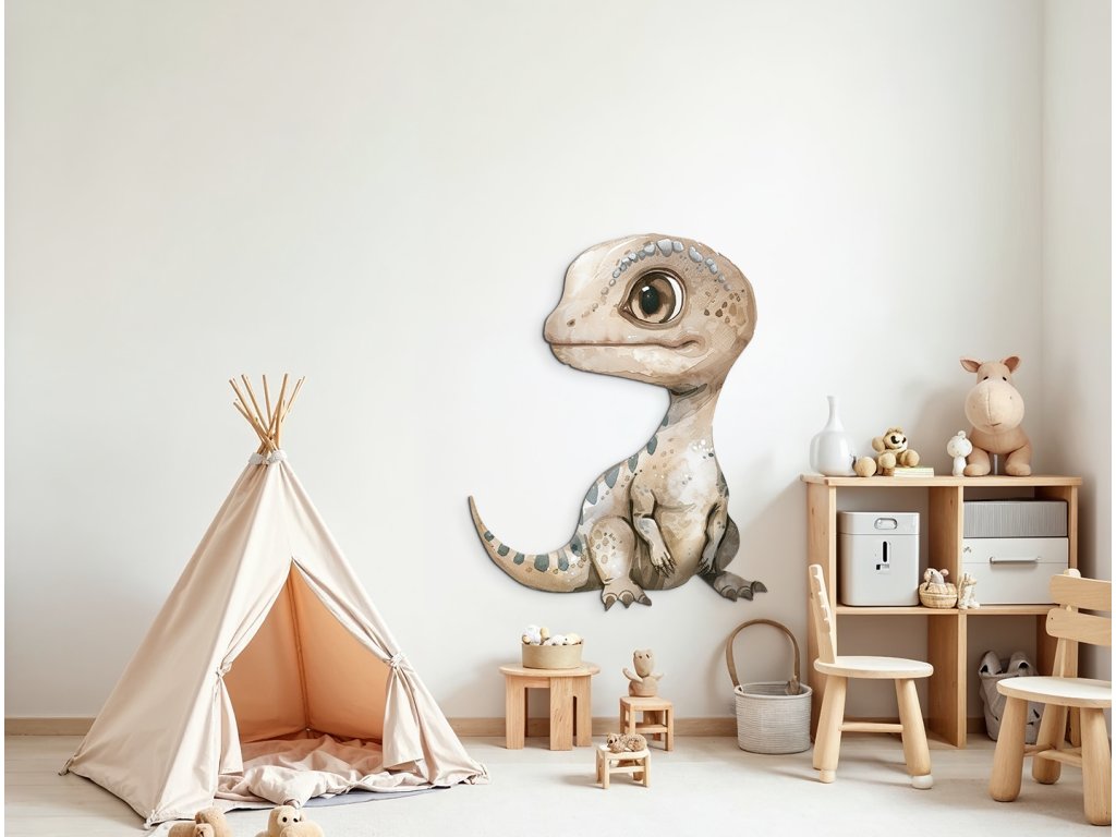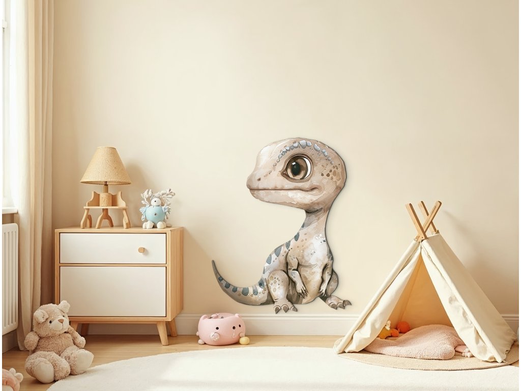 Malý kreslený dinosaurus s krémově béžovou kůží a modro šedými skvrnami vypadá něžně, mile a připraven na nová dobrodružství. Díky jemným tónům je ideální pro výzdobu dětského pokoje – zejména pro malé milovníky pravěku.