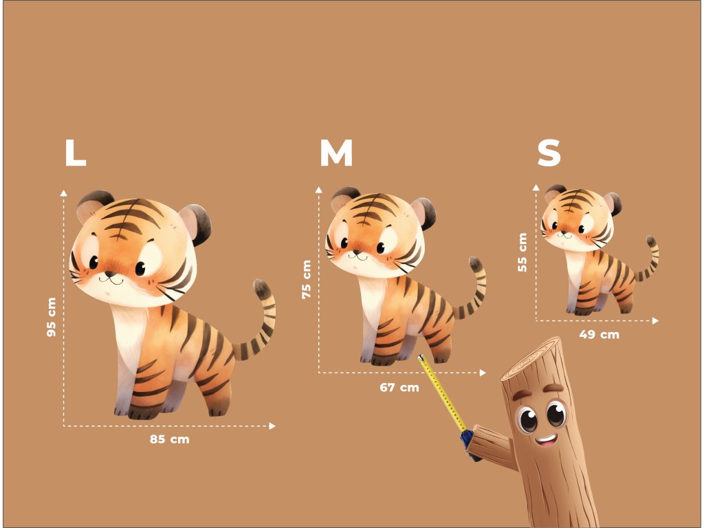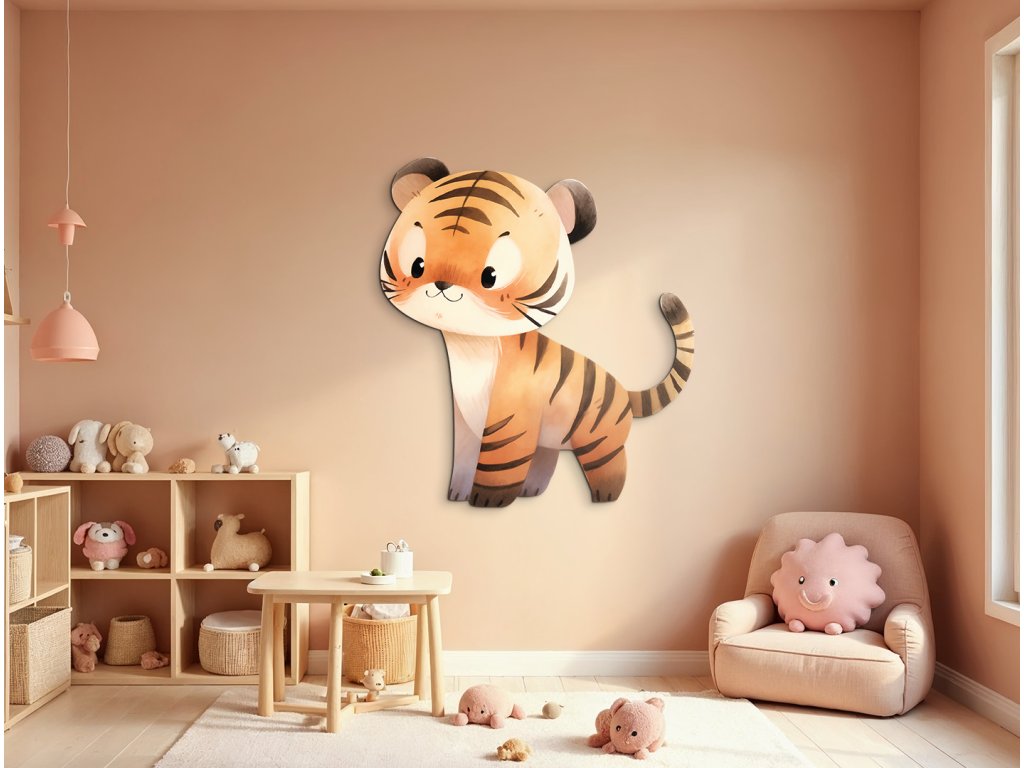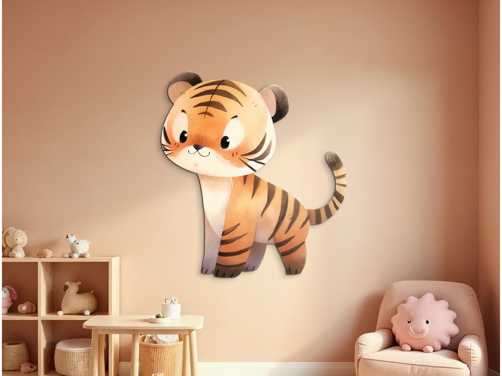 Na obrázku je roztomilé kreslené tygříče s typickým oranžovým kožíškem a výraznými černými pruhy. Tygři patří mezi největší kočkovité šelmy na světě, ale toto mládě je klidné, přátelské a stvořené pro dětský pokoj plný dobrodružství a fantazie.