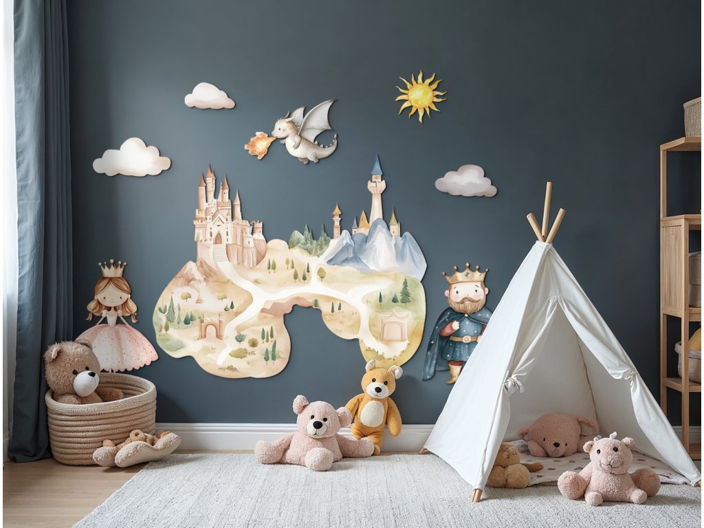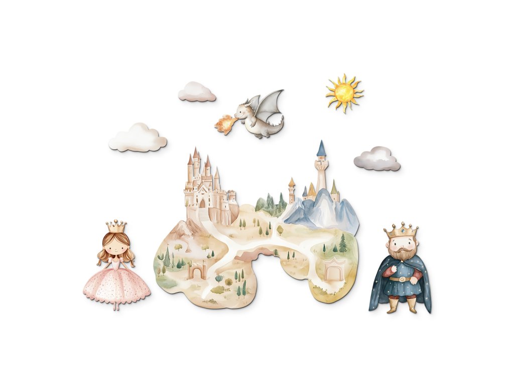 Pohádková dekorace na zeď zobrazující nádherný hrad uprostřed kouzelné krajiny, kde žije král, princezna a přátelský drak. Jemné barvy a veselý kreslený styl vytvářejí kouzelnou atmosféru dobrodružství. Skvělý doplněk do dětského pokoje pro všechny malé milovníky pohádek.