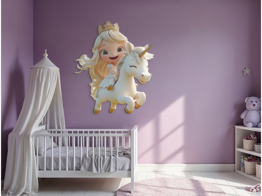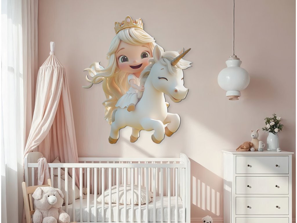 Zlatovláska s úsměvem cválá krajinou snů na svém bílém jednorožci. Tento obrázek v sobě nese radost, kouzlo dětství a krásu pohádky – ideální doplněk pro dívčí pokoj.
