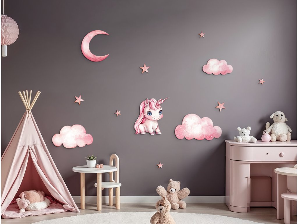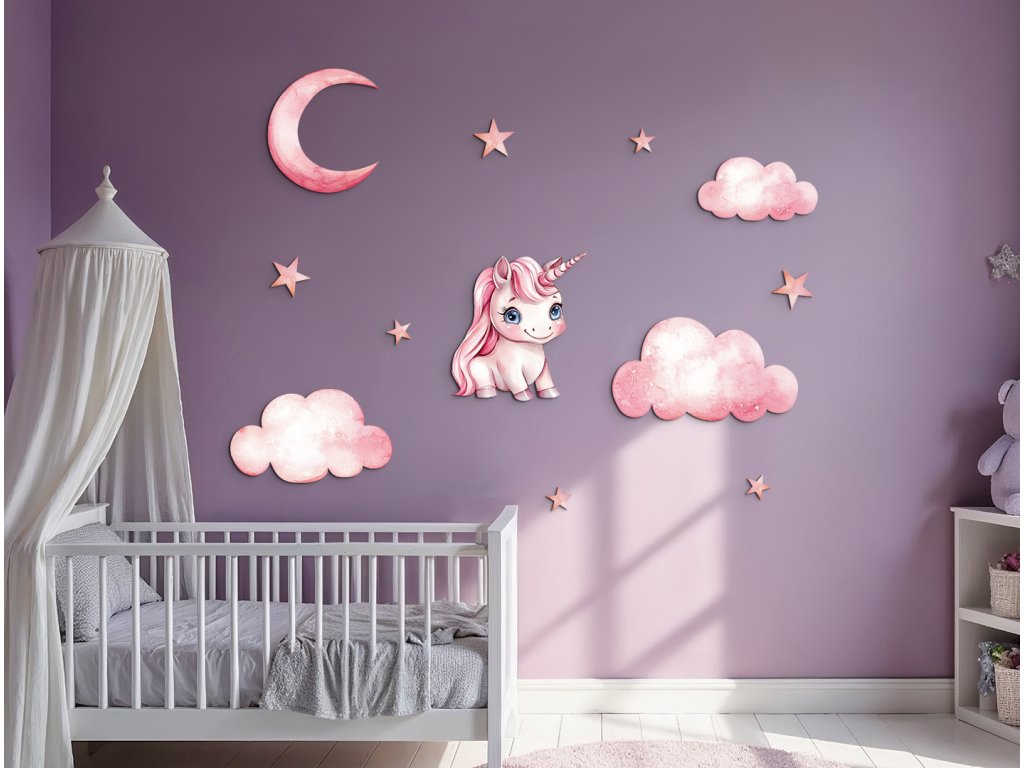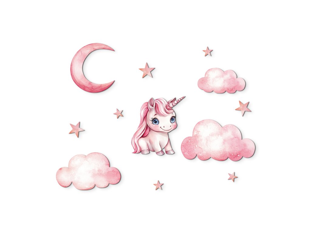 Pohádkový růžový jednorožec se vznáší mezi obláčky, zatímco nad ním září měsíc a mihotavé hvězdy. Ilustrace působí jemně, uklidňujícím a magicky – ideální do pokojíčku malých sníl.