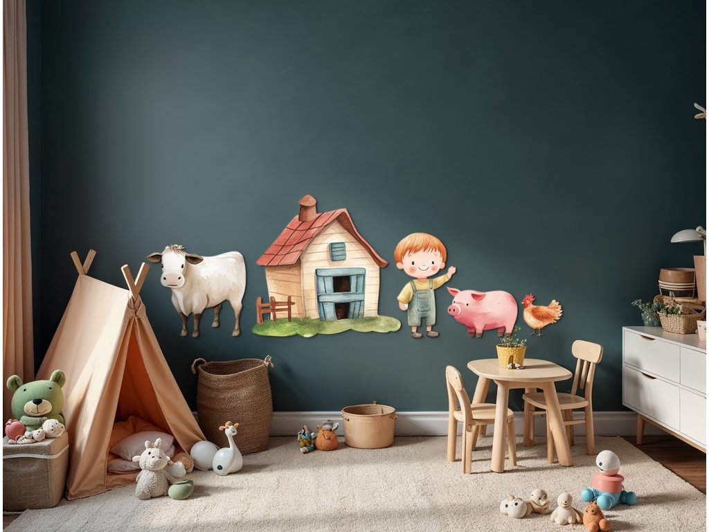 Roztomilá ilustrace zachycuje scénu z farmy, kde malý chlapeček v montérkách vesele mívá při své stodole. Společnost mu dělají typická farmářská zvířátka – kráva, prasátko a slepice. Celý obrázek působí teplo, vesele a je jako stvořený do dětského pokoje nebo herního koutku s farmářskou tématikou.