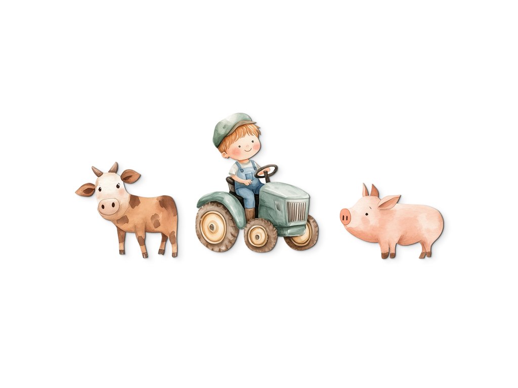 Malý farmáček vesele jezdí na svém traktoru, doprovázený prasátkem a kravičkou – dvěma věrnými kamarády ze statku. Tato milá ilustrace je plná barev, pohybu a venkovského života. Ideální dekorace do dětského pokoje pro všechny, kteří milují farmářský svět a zvířátka.